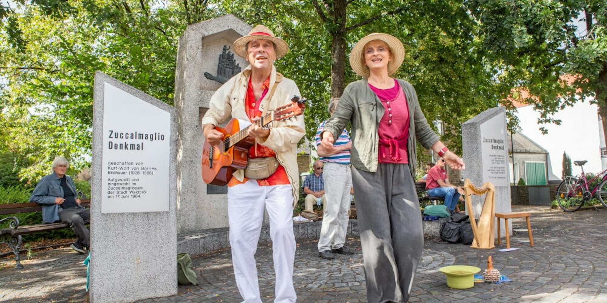 An der Sehnsucht nach Musik hat sich nichts geändert, wie der Auftakt zum Waldbröler Musiksommer 2020 am Wochenende bewiesen hat. Knapp 50 Zuhörer und „Mitsinger“ versammelten sich am Samstagnachmittag unter der Linde am Zuccalmaglio-Denkmal zum „Offenen Singen“. Obertonkünstler Christian Bollmann, Harfenistin Lorena Wolfewicz sowie Martin und August Schulte an Akkordeon und Trommel hatten ein Programm zusammengestellt, das – kaum war das Glockenspiel mit Zuccalmaglios „größtem Hit“ verklungen, seinen Anfang – natürlich – mit „Kein schöner Land“ nahm.