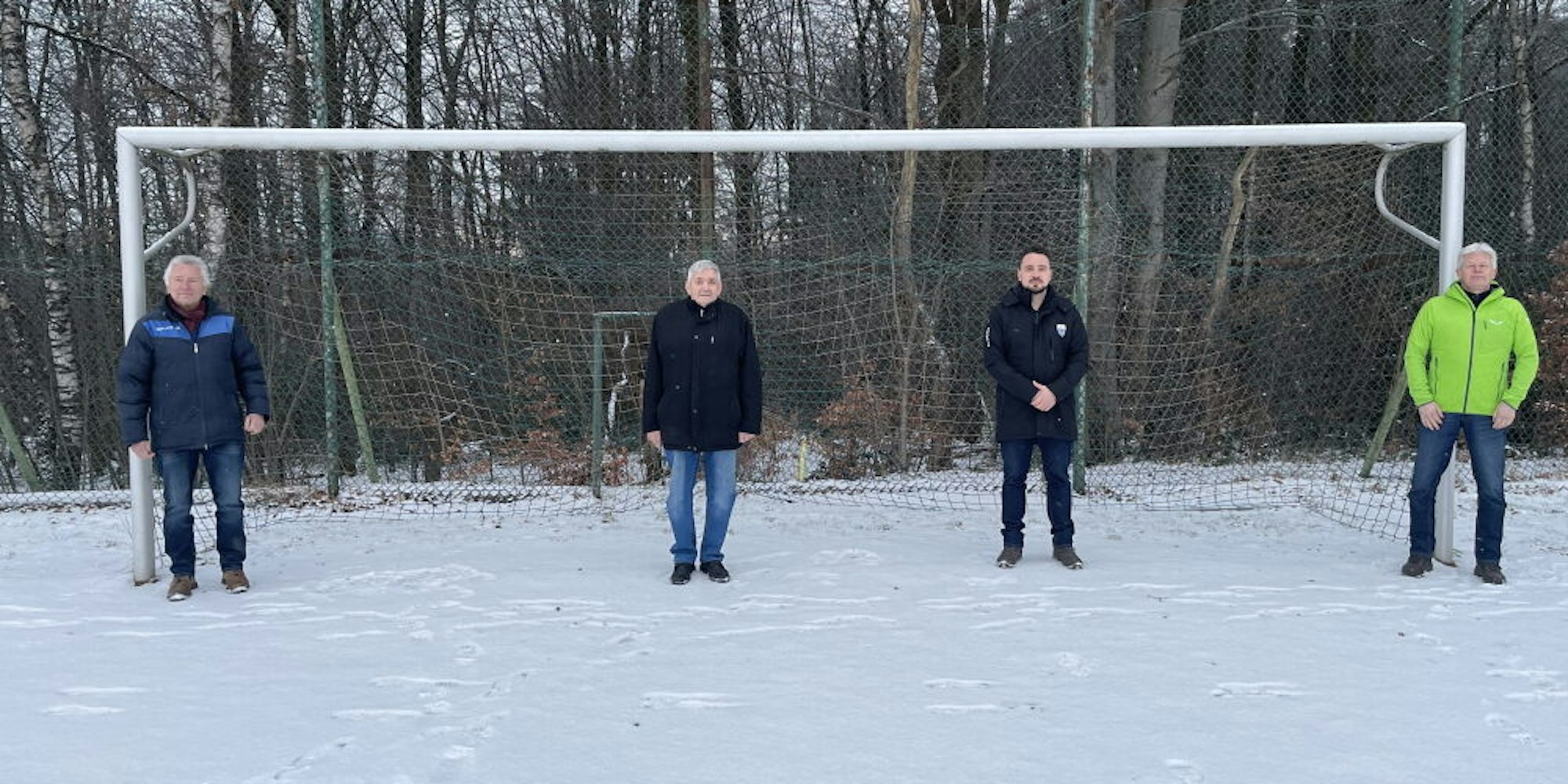 Wenn es nach den Verantwortlichen des SV Hermesdorf Werner Hülsberg, Hans Beer, Waldemar Schlapak und Thomas Werner (v. l.) geht, soll im nächsten Jahr unter der Schneedecke keine Asche mehr sein, sondern Naturrasen.