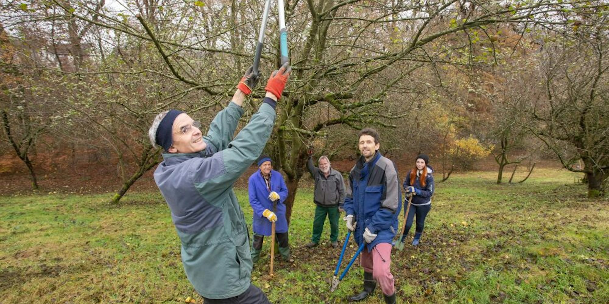 Marko Prietz (l.) und vier weitere Mitglieder der Nabu-Ortsgruppe kümmerten sich um eine Streuobstwiese, die vor 25 Jahren als Ausgleichsfläche angelegt worden war.
