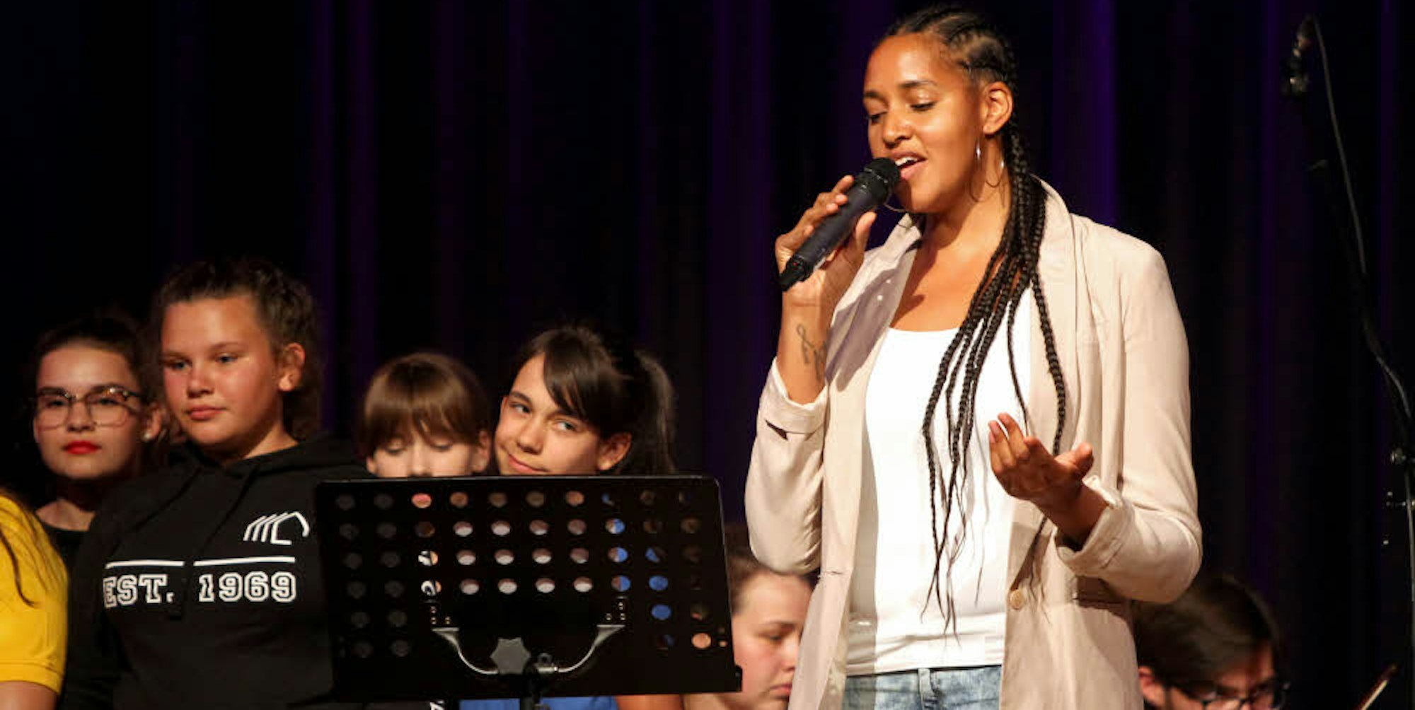 Am Festabend stand Sängerin Cassandra Steen mit den Schulchören und dem Schulorchester auf der Bühne.