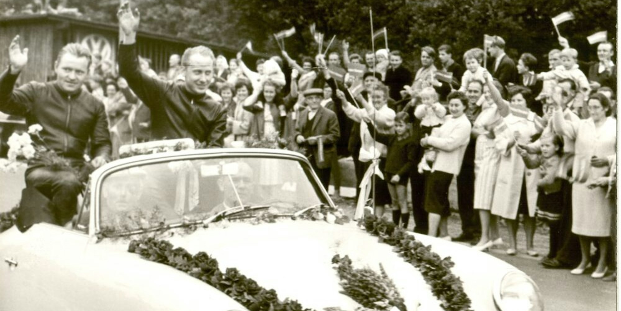 Emil Hörner (l. i. Wagen) und Max Deubel kommen beim Empfang in Bielstein.