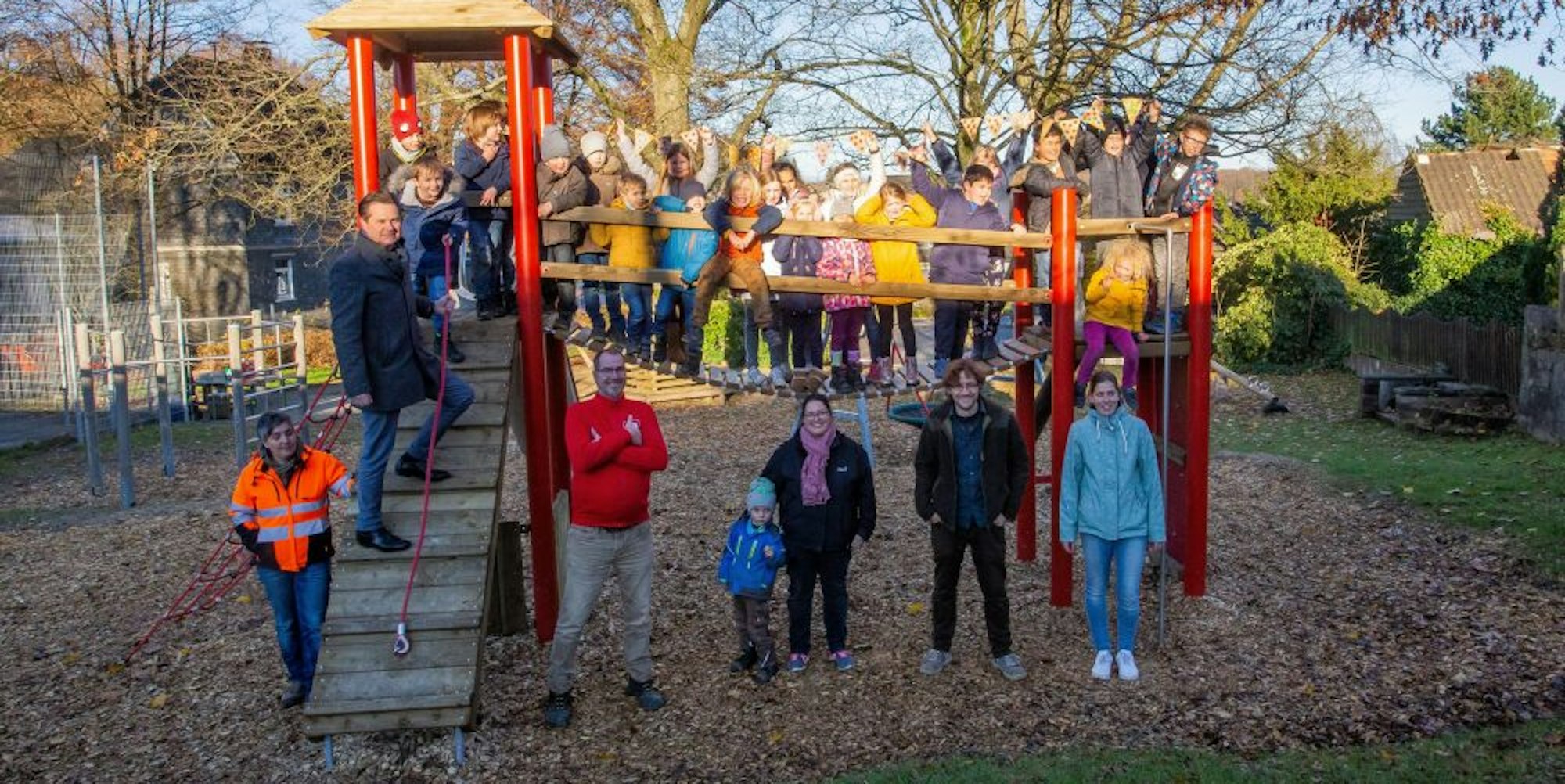 „30 000 Euro hat die Stadt Wiehl investiert“, sagte der Bürgermeister. „Wenn ich mir anschaue, mit wie viel Spaß die Kinder bereits hier spielen, weiß ich, dass das Geld gut angelegt ist.“ Die Spiellandschaft besteht aus zwei mit einer Hängebrücke verbundenen Türmen, einer Freeclimbing-Wand und einem Kletternetz und bietet so viele Möglichkeiten, sich auszutoben. Zudem wurde ein altes Bodenkarussell durch eine Drehscheibe ersetzt.