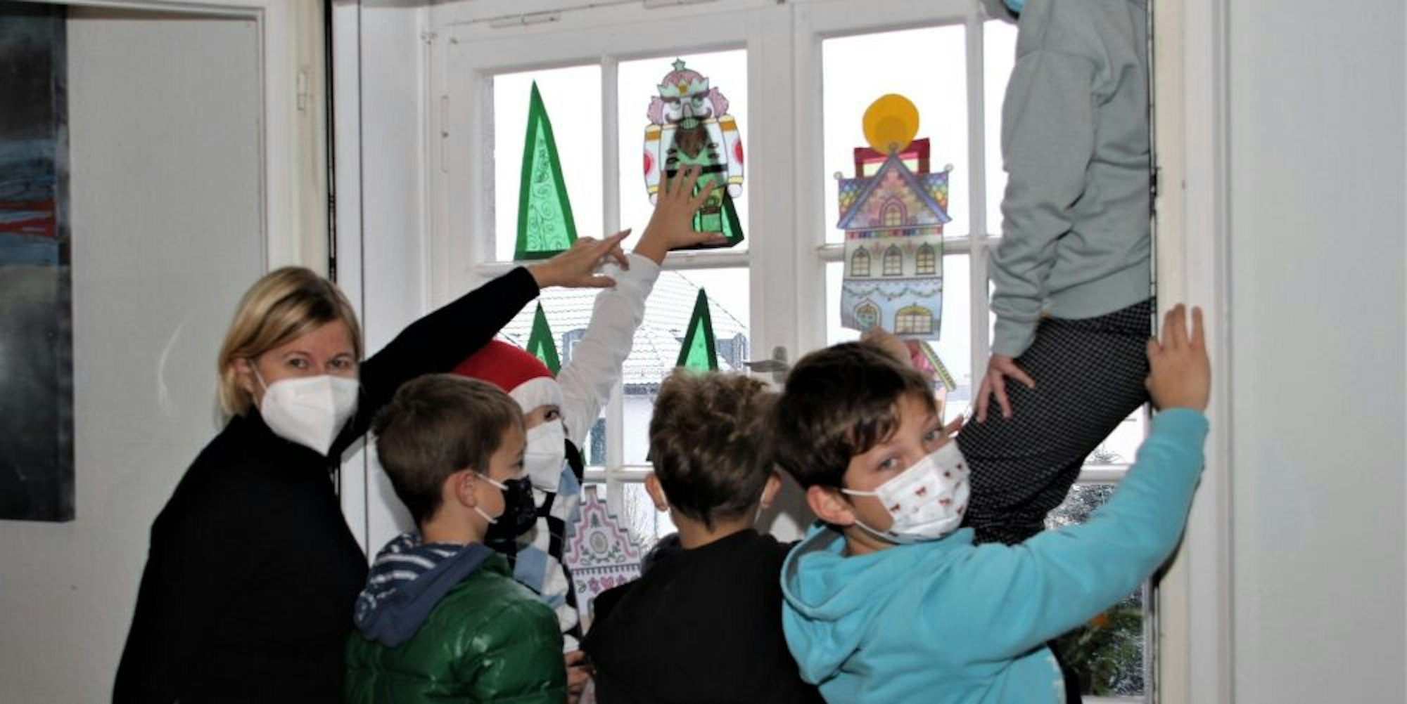 Kinder aus Agathaberg und von der Albert-Schweitzer-Schule dekorieren die Rathaus-Fenster, dabei hilft die kommissarische Schulchefin Annette Klein (links).