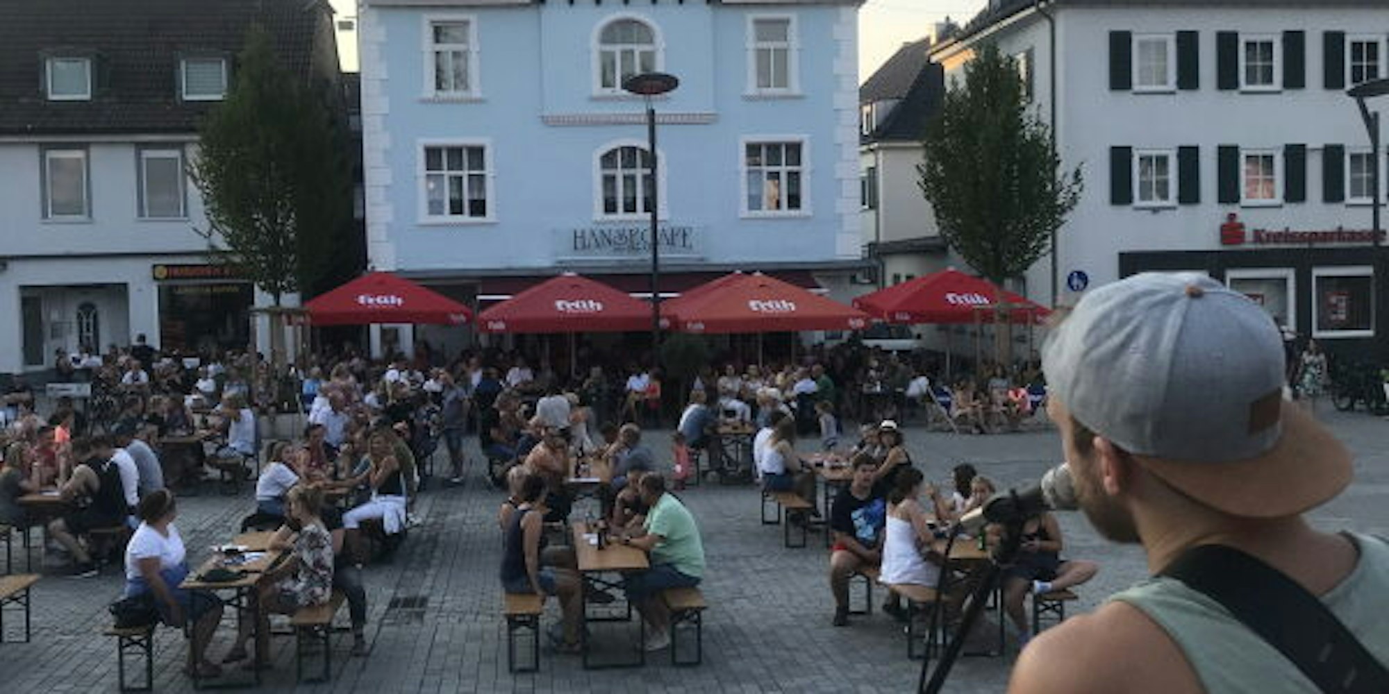 Gegen 21 Uhr sind alle Plätze der umliegenden Außengastronomie und an den Biertischen auf dem Marktplatz belegt, Kinder tanzen vor der Treppe und der junge Sänger fordert das Publikum zum Mitsingen auf. Unter den Dächern der Häuser, die den Marktplatz einrahmen, leuchten Lichterketten und es wird sich laut unterhalten, geschunkelt, gelacht.