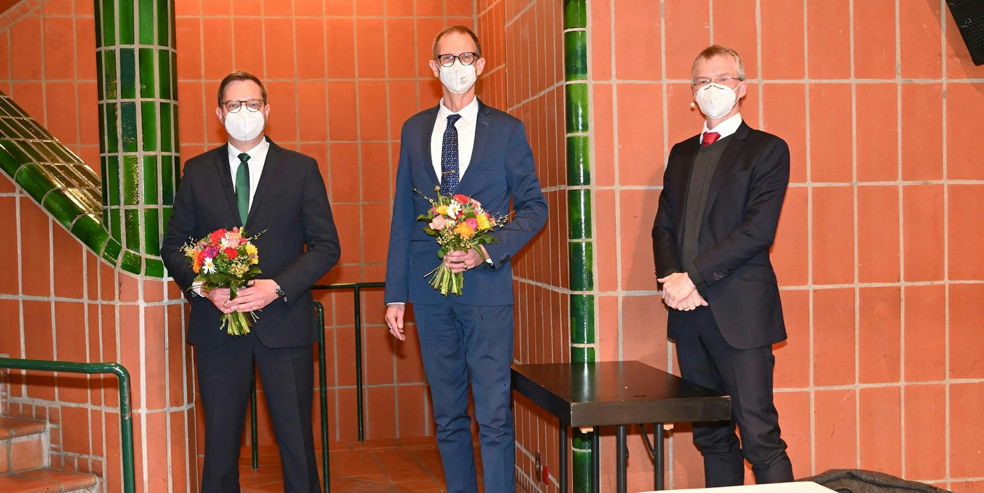 Vor der zeitlosen Klassik des gekachelten „Bergischen Löwen“ überreichte Bürgermeister Frank Stein (r.) Blumensträuße an die neugewählten Beigeordneten Thore Eggert (l.) und Ragnar Migenda (M.).