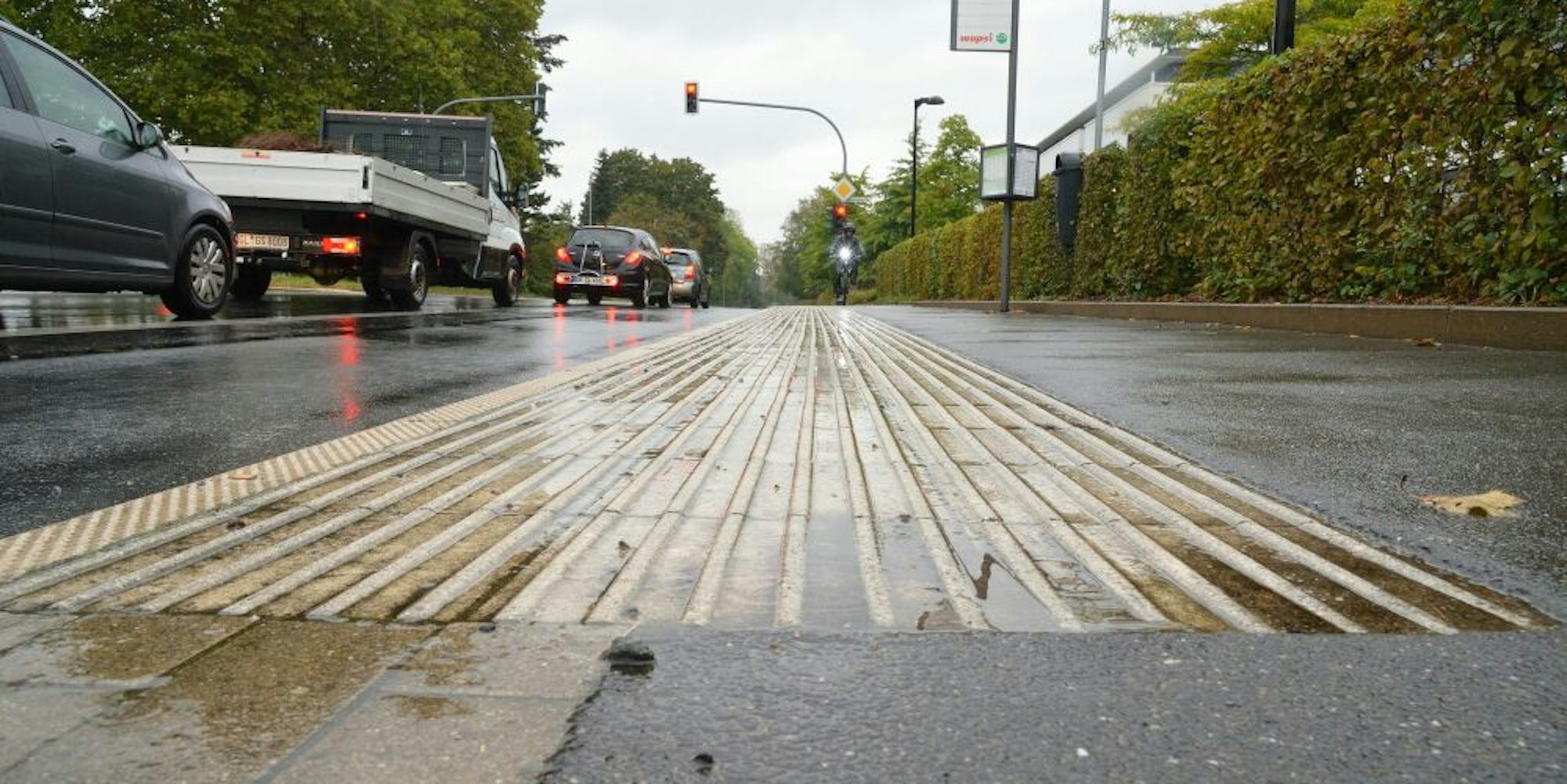 Wohl dem Radfahrer, der bei Regen und Laubfall nicht in diesen Rillen fahren muss.