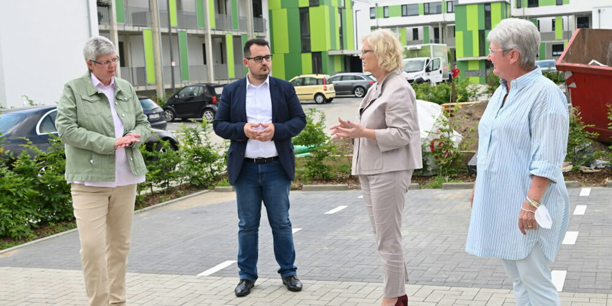 Bergisch Gladbach – Ein neues Wohnquartier errichtet die Rheinisch-Bergische Siedlungsgesellschaft im Bergisch Gladbacher Stadtteil Hand. 99 Wohnungen verteilt auf sechs Häuser, die zum großen Teil schon fertiggestellt und auch bezogen sind. Barrierefreier Wohnraum, Einsatz umweltfreundlicher Energien, alles integriert in einem gewachsenen Stadtteil – da ist Bundesministerin Christine Lamprecht neugierig geworden. Zuständig für das Ressort Justiz und Verbraucherschutz hat die SPD-Politikern gestern auf Einladung von Helene Hammelrath, ehemalige SPD-Landtagsabgeordnete, und Kastriot Krasniqi, SPD-Kandidat in Rhein-Berg für die nächste Bundestagswahl, die neue Wohnanlage angesehen.