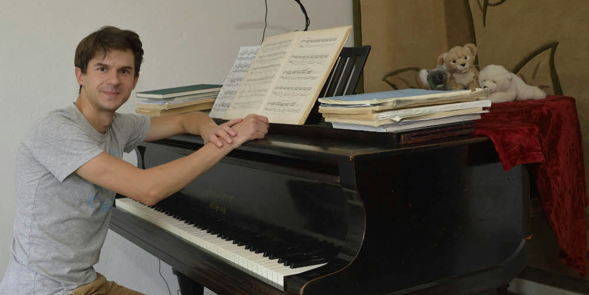 Bergisch Gladbach – Auf dem schwarzen Flügel sitzen ein Löwenbaby, ein Koala und ein Eisbär aus Plüsch. Sie sind immer dabei, wenn Roman Salyutov trainiert, manchmal auch, wenn er auf Konzertreise geht. Jeden Tag übt der Pianist stundenlang, da kriegen die Maskottchen ganz schön was auf die Ohren – ebenso wie die Nachbarn im beschaulichen Herkenrath, wo der Musiker wohnt.