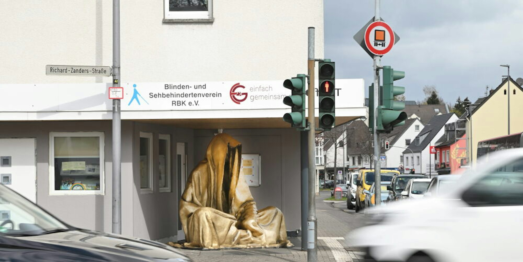 Bergisch Gladbach – Da schaut mancher Autofahrer überrascht: An der zentralen Kreuzung in Bergisch Gladbach-Heidkamp steht im Eingang der Geschäftsstelle des Vereins „einfach gemeinsam“ und des Blinden- und Sehbehindertenvereins RBK eine goldene Skulptur.
