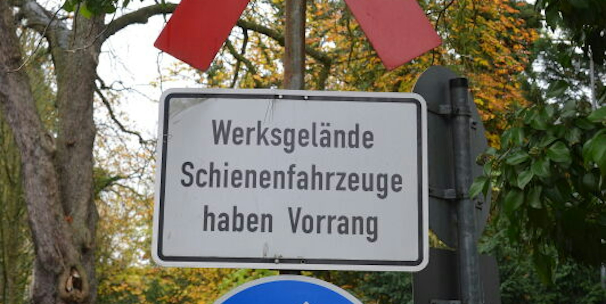 Ein Verkehrsschild auf dem Zanders-Gelände. Schienenfahrzeuge fahren dort schon lange nicht mehr.