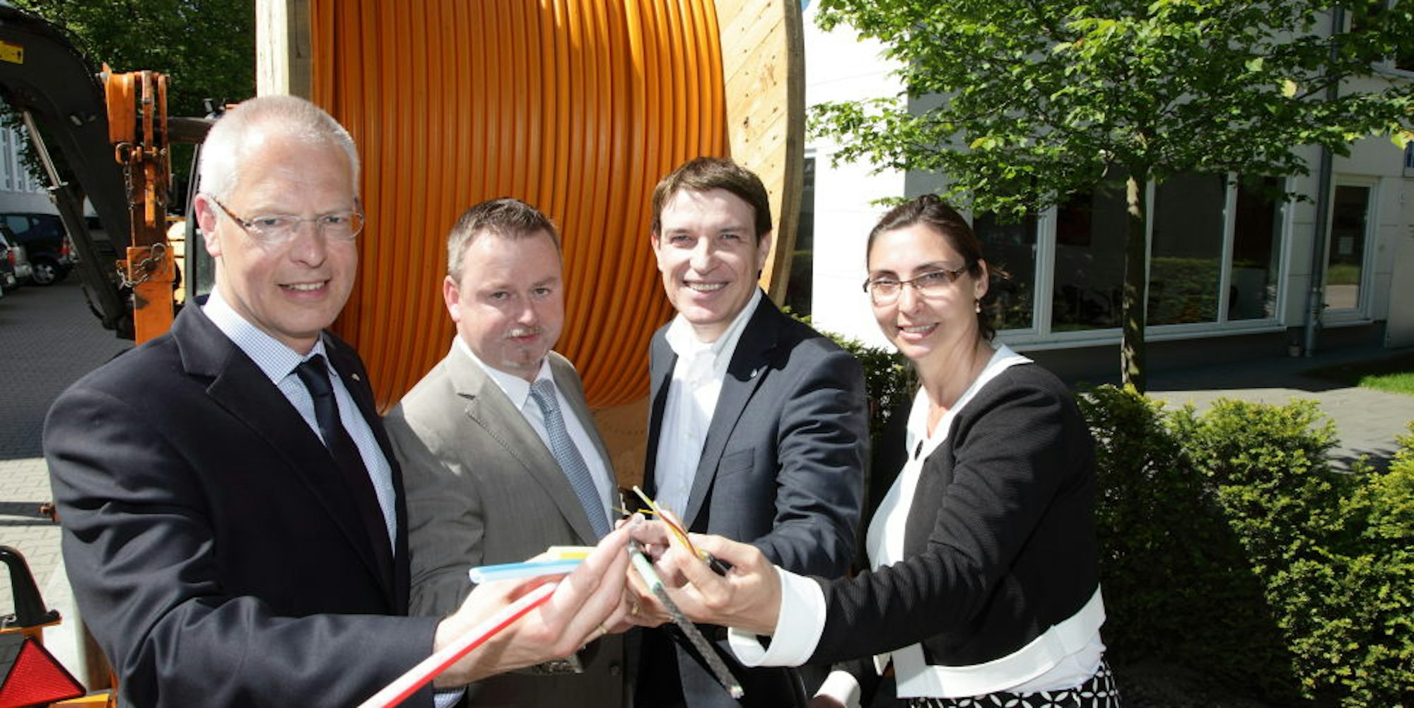 Auch in seiner Zeit als Landrat war der Breitbandausbau bereits ein Thema für den heutigen Bundestagsabgeordneten Dr. Hermann-Josef Tebroke (links), hier mit Kreisdirektor Dr. Erik Werdel (2.v.r.), Peter Kroppen und Anja Oppermann (Telekom) bei einem Spatenstich in Rösrath.