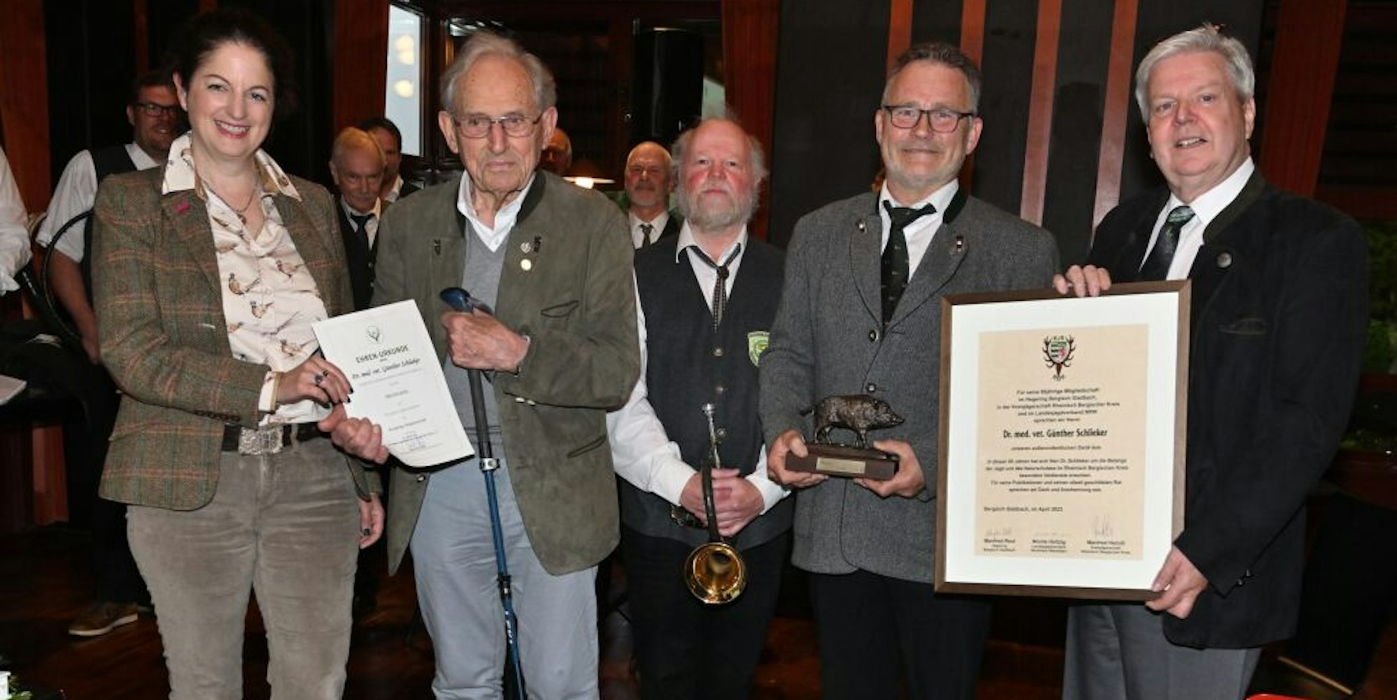 Bergisch Gladbach – Ehrung 25 Jahre Engagement in einer Organisation oder Vereinigung sind bereits höchst ehrenhaft, 50-jährige Aktivität schon recht selten. Wofür der langjährigen Kreisveterinär des Rheinisch-Bergischen Kreises, Dr. Günther Schlieker, jetzt allerdings im Spiegelsaal des Bergischen Löwen ausgezeichnet wurde, übertrifft alles. Für unfassbare 80-jährige Mitgliedschaft in der hiesigen Jägerschaft wurde der 98-Jährige gewürdigt – und sein damit verbundenes außerordentlichen Engagement für Jagd und Naturschutz.