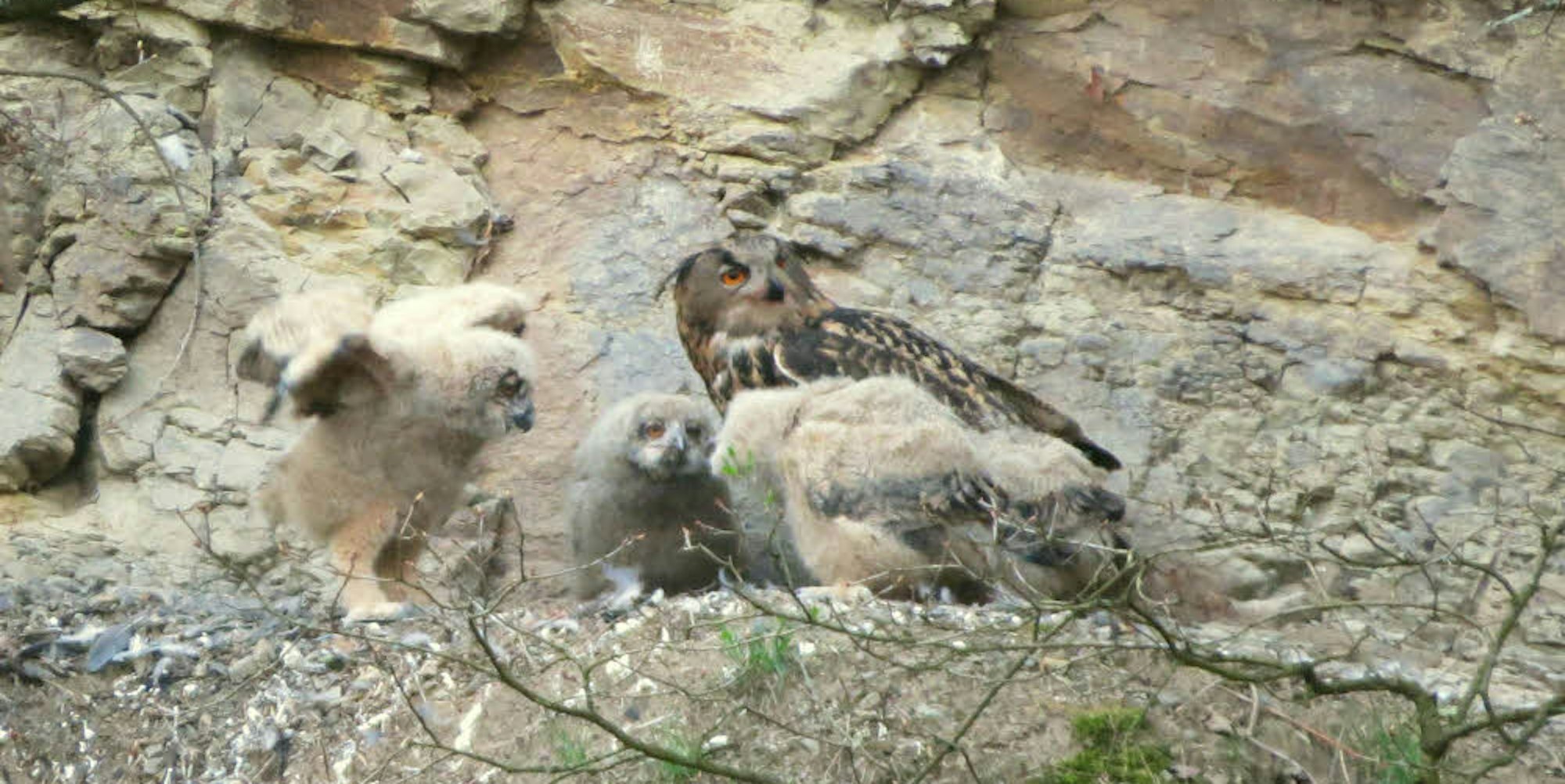 Und der Grand-Duc, der Großherzog, wie der auch als Adlereule bezeichnete Uhu in Frankreich genannt wird, ist nicht nur früh dran, sondern er hat auch ein besonderes großes Gelege hochgezogen: Vier Nestlinge drängen sich auf dem Felsband des Steinbruchs und werden von der Mama fürsorglich behütet. Im Schnitt bringen es Uhus auf zwei bis drei Nestlinge pro Brut, von denen 70 Prozent das erste Jahr nicht überstehen. Bei Vieren ist also rein statistisch damit zu rechnen, dass einer das Erwachsenenalter erreicht und dann seine 20 bis 30 Jahre Lebenszeit vollmacht.