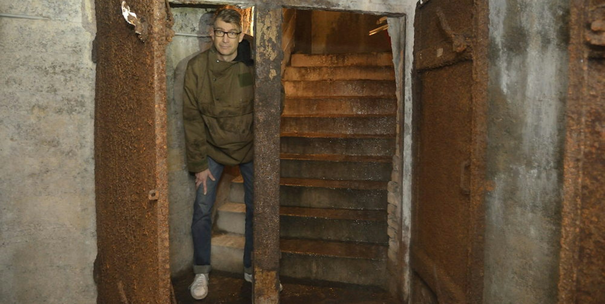 Robert Fahr zeigt einen Notausgang des Bunkers Rotdornallee.