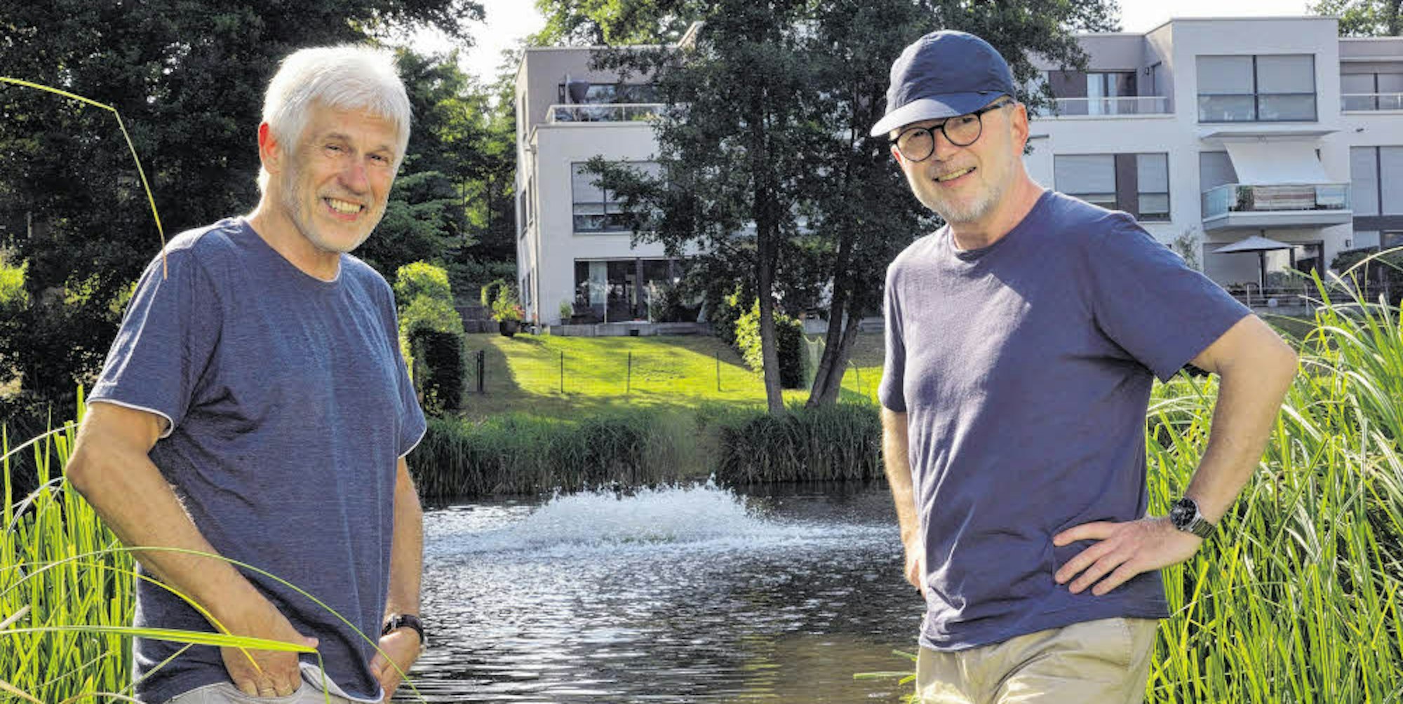 Die Sauerstoffpumpe im Teich wirbelt Wasser hoch. Claus Braun (l.) und Jürgen Spannagel gehören zum Team der Anwohner, die für den Betrieb sorgen.