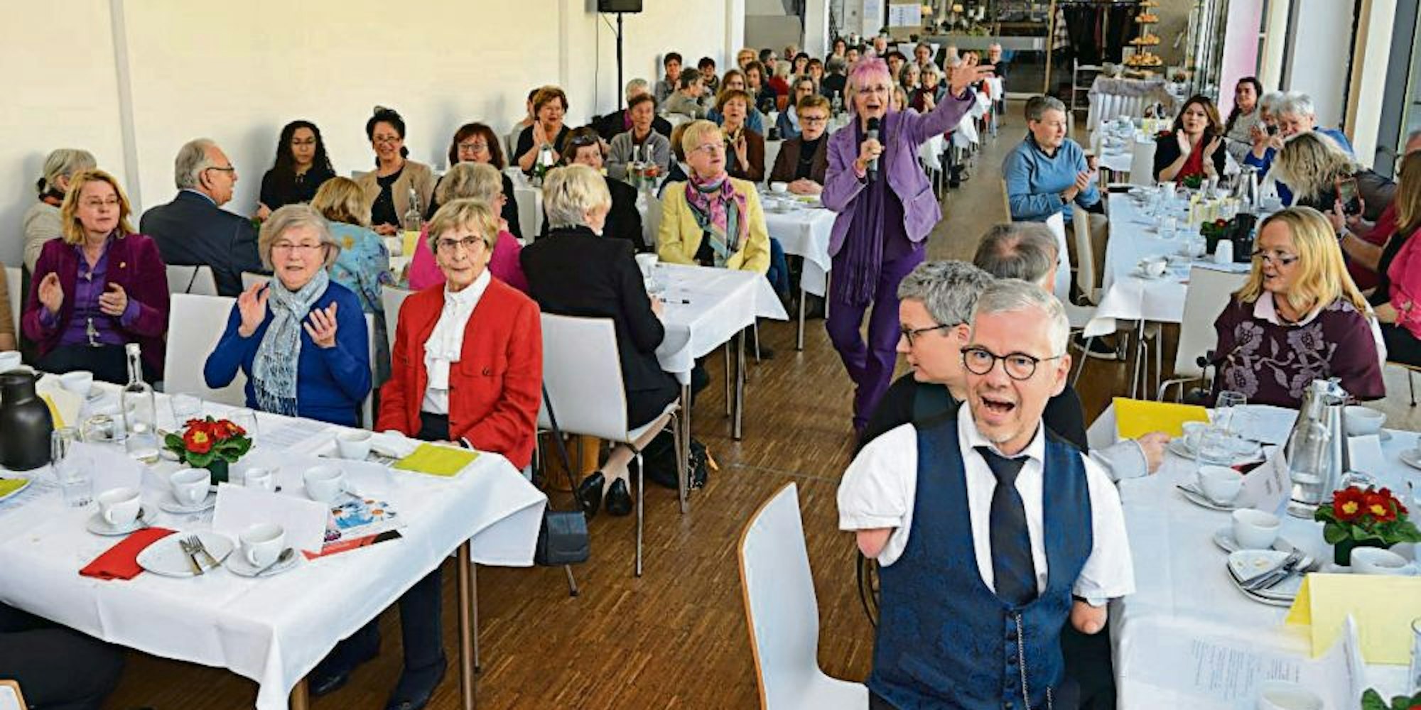 Inklusion sei zwar kein frauenspezifisches Thema, „aber eine Frau hält gleich ein Referat“, sagte sie mit Blick auf den Vortrag der städtischen Behindertenbeauftraften. „Claudia Schmidt-Herterich ist eine unserer Rosenfrauen gewesen. Und es geht ja um Behinderung, zu dem Thema singe ich gleich etwas. Von daher finde ich das okay.“ Das Thema Inklusion gehe durchaus die Frauen an. Auch der Kabarett-Beitrag von Schmidt sei sinnvoll: „Ich kenne keine Frau, die behindert ist und Kabarett machen kann, und deshalb haben wir den Rainer Schmidt.“ (sis)