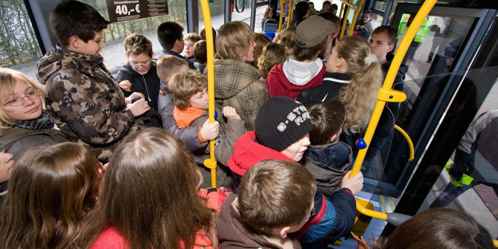 Volle Schulbusse (hier vor der Corona-Pandemie) drohen mit Öffnung aller Schulen nach den Sommerferien wieder.