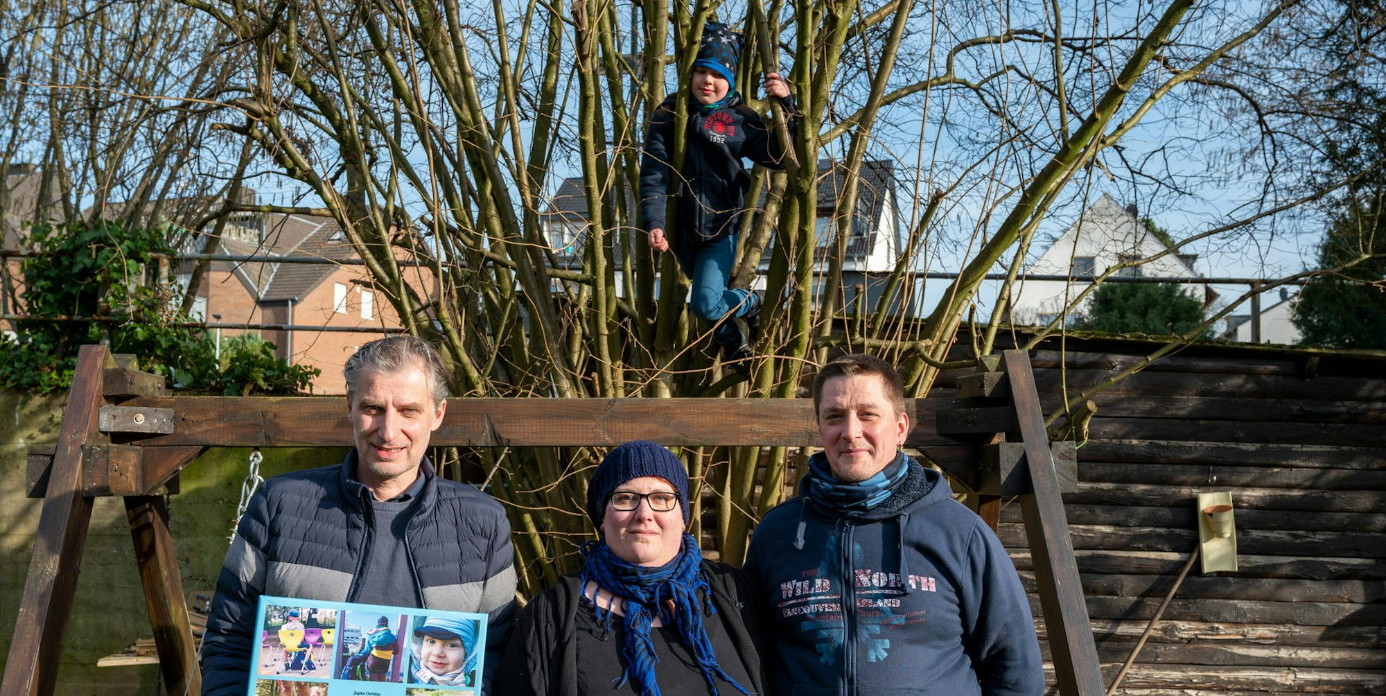 „Ihrem“ Professor Rudlowski (l.) überreichten Jayden (im Baum), Tatjana und Oliver Preuß eine Collage mit Kindheitsfotos.