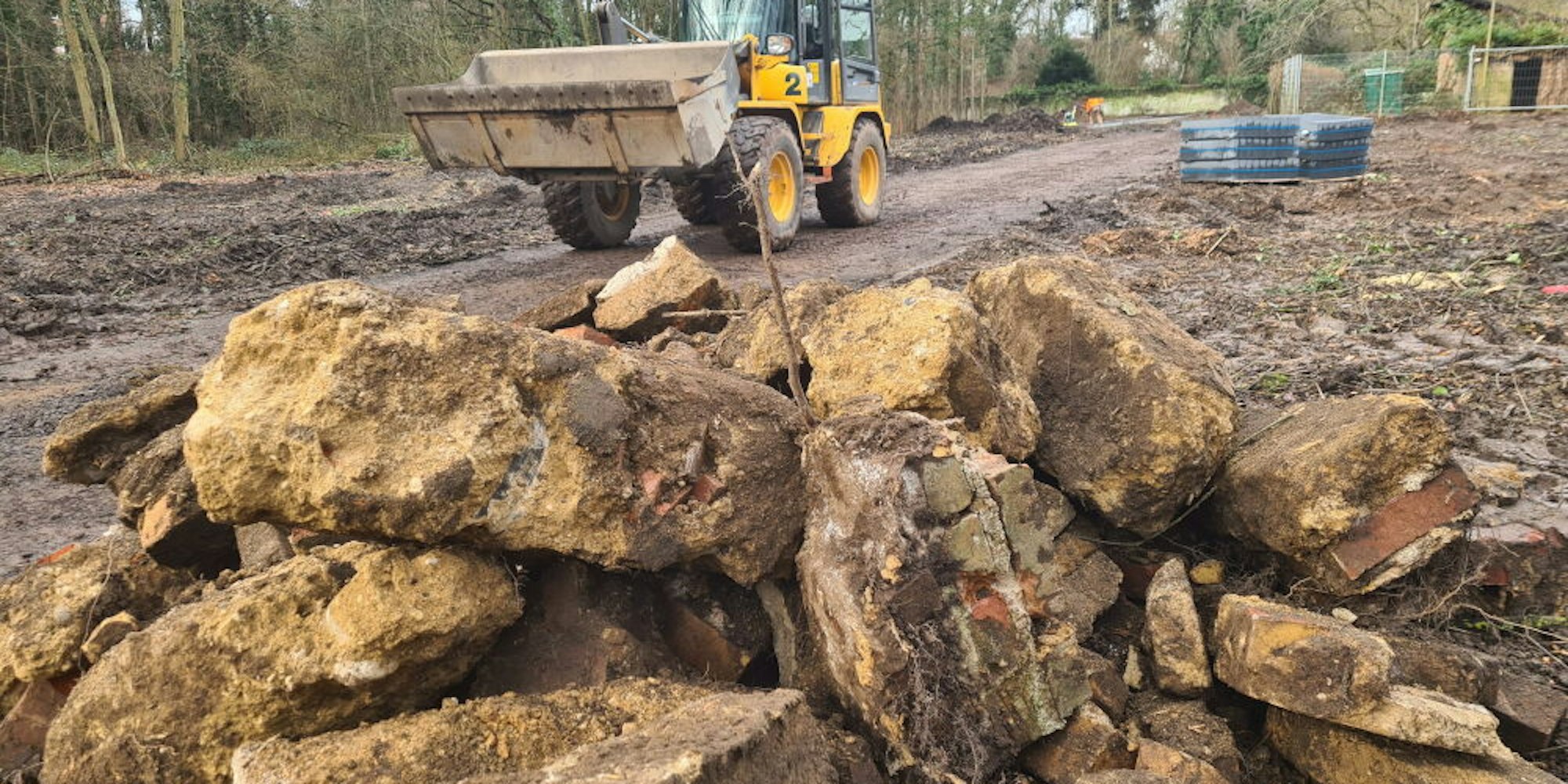 Bedburg – Schlammige Wege, die ein Radlader aufwühlt, gerodeter Wald, aufgetürmter Schutt – der Schlosspark ist in Höhe des Tennisclubs derzeit alles andere als adrett. Doch bei den Arbeiten handelt es sich um den Auftakt zur Belebung und Verschönerung des Parks im Herzen der Stadt. Und um den sichtbaren Auftakt zur Umsetzung des Isek, des Integrierten Städtebaulichen Entwicklungskonzepts, bei dem mit vielen Millionen Euro über mehrere Jahre die Bedburger Innenstadt umgestaltet werden soll.