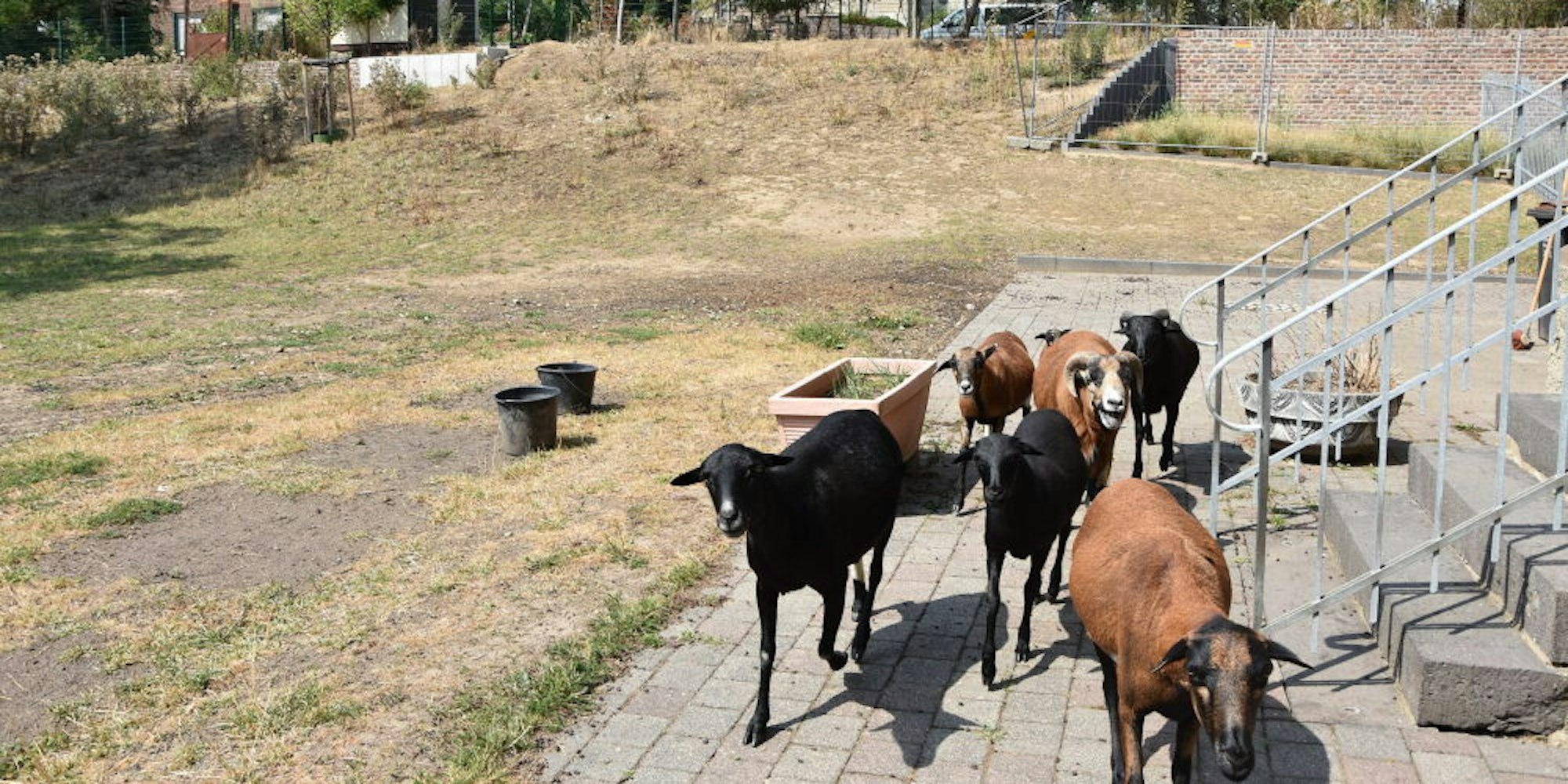 Der Leitbock, zwei Muttertiere und drei ältere Lämmer – zwei davon sind im Dezember geborene Zwillinge – zogen im April auf die Wiese hinter dem Pastorat, direkt neben der St.-Remigius-Kirche . Auf ihrer angestammten Weide in Elsdorf war das Gras abgefressen, und durch die Trockenheit wuchs keines nach. Auf der Pastoratswiese war der Tisch für die Schafe noch reich gedeckt. So kam der Halter der Tiere, der auch im Kirchenvorstand der Pfarre aktiv ist, auf die Idee, zwei Fliegen mit einer Klappe zu schlagen. Inzwischen ist die Wiese zwar ebenfalls gut abgegrast, doch bis dahin konnten die Tiere ihren Appetit stillen und der Rasenmäher im Schuppen bleiben. In dem wurde eine Unterstellmöglichkeit eingerichtet, zudem sorgen zwei mächtige Laubbäume für ausreichend Schatten.