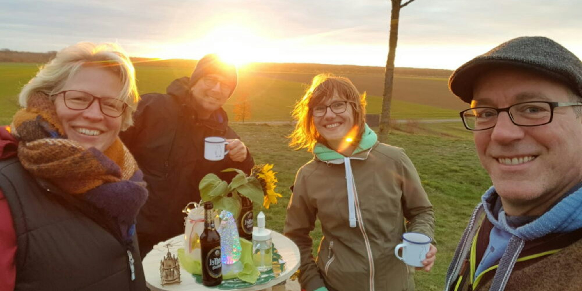 „Meine Frau und ich sind trotzdem gelaufen“, erzählt Christian Brink. Und das habe auch das befreundete Paar Falk Steffens und Yvonne Fritz angeregt, sich ebenfalls auf Wanderschaft zu begeben: „Wir machen das auch“, hätten sie gesagt, erzählt Brink. Steffens und Fritz bauten sich eigens einen dreibeinigen Holztisch, packten ein paar Getränke in den Bollerwagen und machten sich auf zum Marienfeld.