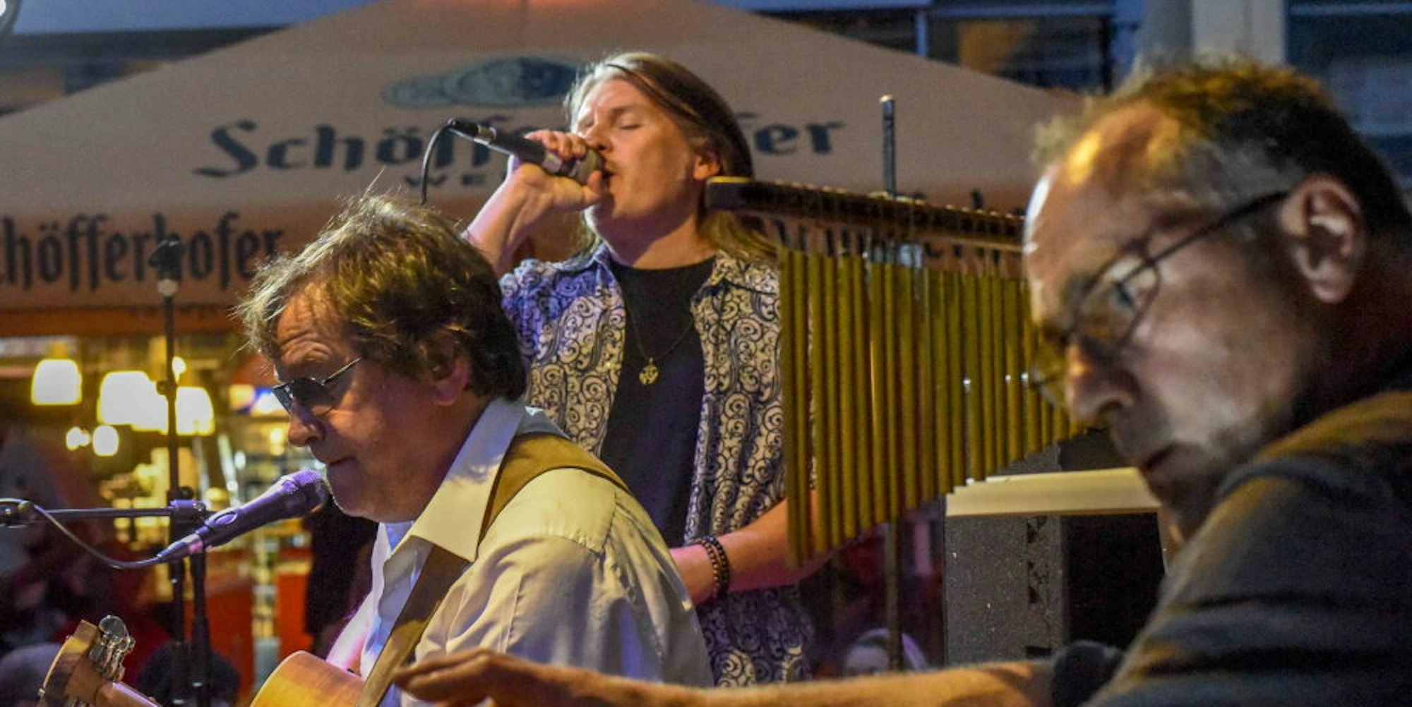 Der Flut setzten Kirchenbauer und Fleischer gleich ein beherztes „Here Comes the Sun“ entgegen. Was das Publikum an musikalischen Leckerbissen noch erwarten konnte, das wussten die Musiker vorher teils selbst nicht. Michael Dorp, Frontmann der Rockband Flying Circus, nahm es gelassen. So umfassend sei das gemeinsame Repertoire mit Kirchenbauer, da finde sich schon etwas. Zur prägnanten Stimme Dorps zeigte sich Kirchenbauer auf seiner Westerngitarre mit elektrischem Pickup mit allen Wassern des Rockgitarristen gewaschen. Wie immer machte Kirchenbauer aus „Sultans of Swing“, „Message in a Bottle“ oder „All Right Now“ sein eigenes Ding.