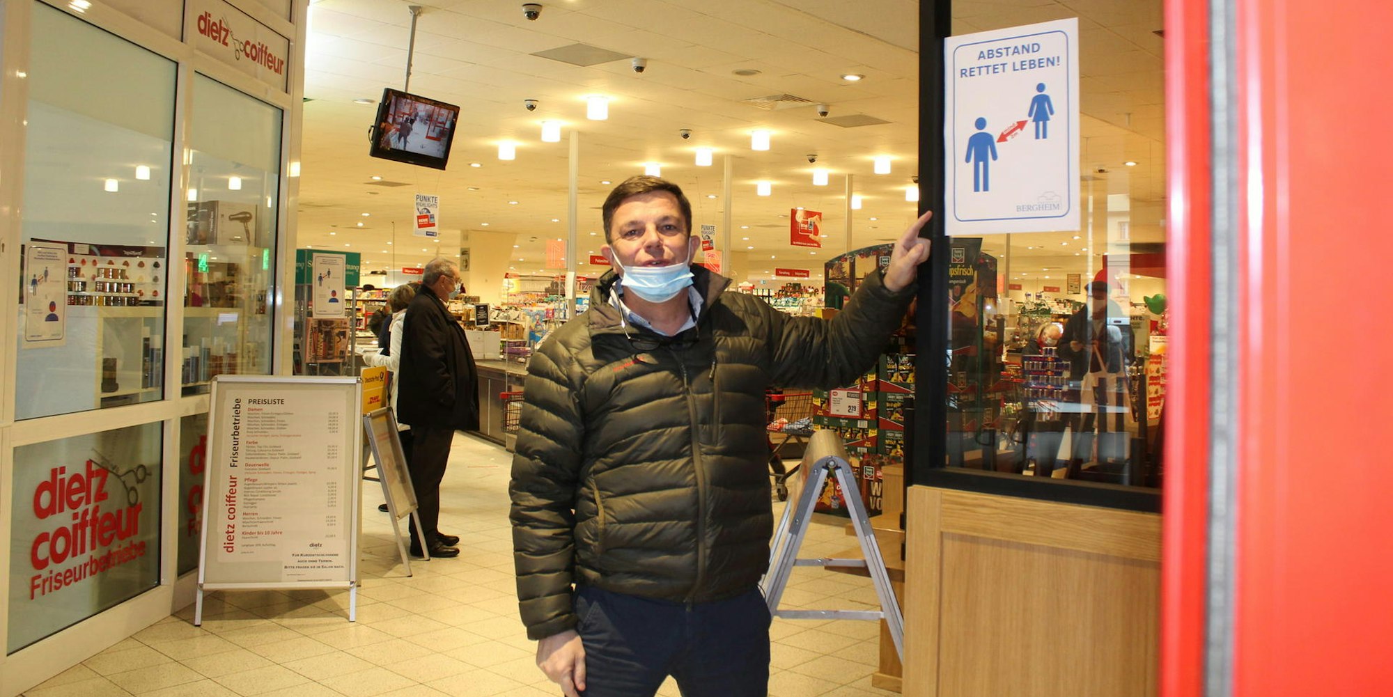 Abstand rettet Leben: Peter Richrath, Bergheimer Rewe-Betreiber, rechnet mit vielen Kunden kurz vor Weihnachten.