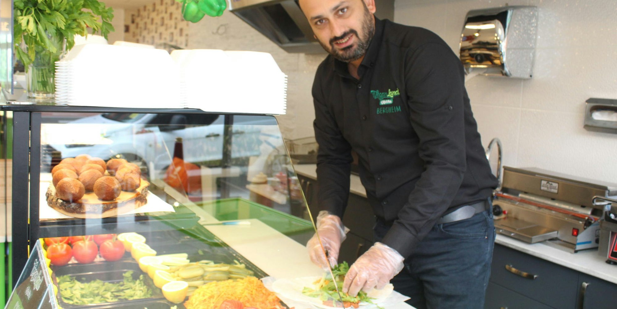 Bergheim – Noch ist es recht ruhig in der Veganland-Filiale, der Angestellte Abdullah Sen nimmt noch die letzten Reinigungen vor, bevor am Mittag die ersten Kundinnen und Kunden kommen. An der Kölner Straße gibt es seit etwa sieben Monaten den ersten rein veganen Imbiss in Bergheim. Die Filiale von Cem Koroglu gehört zum Kölner Franchise-Unternehmen Veganland Çiğ Köfte.