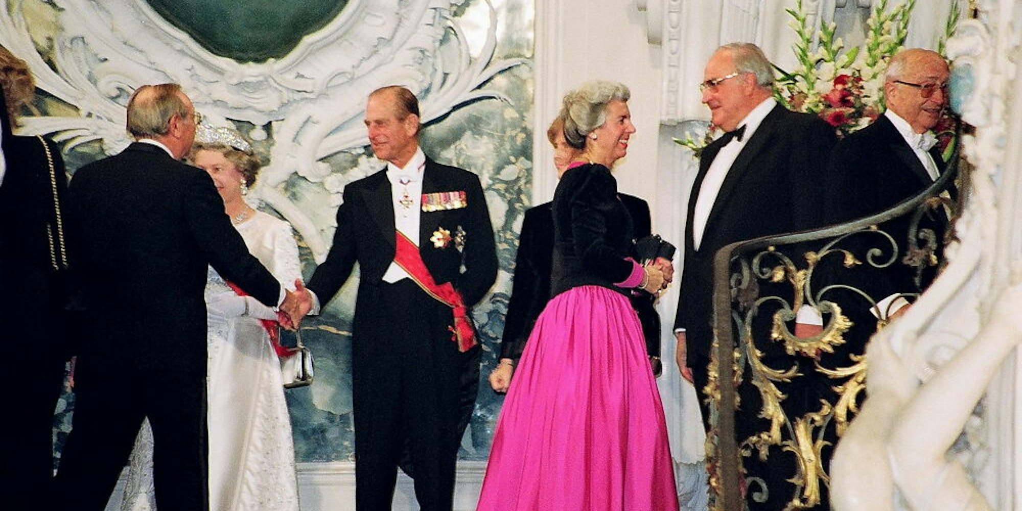 Ausgewählte Gäste wurden von Königin Elisabeth II. und ihrem Mann Prinz Philip begrüßt. Im Gespräch Bundeskanzler Helmut Kohl.
