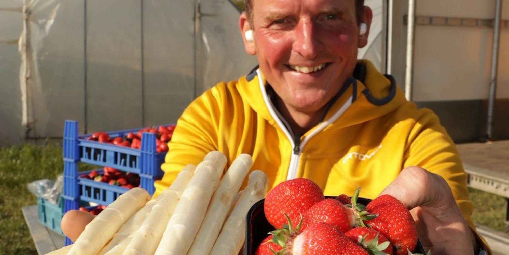 Klaus Langen präsentiert Spargel und Erdbeeren.