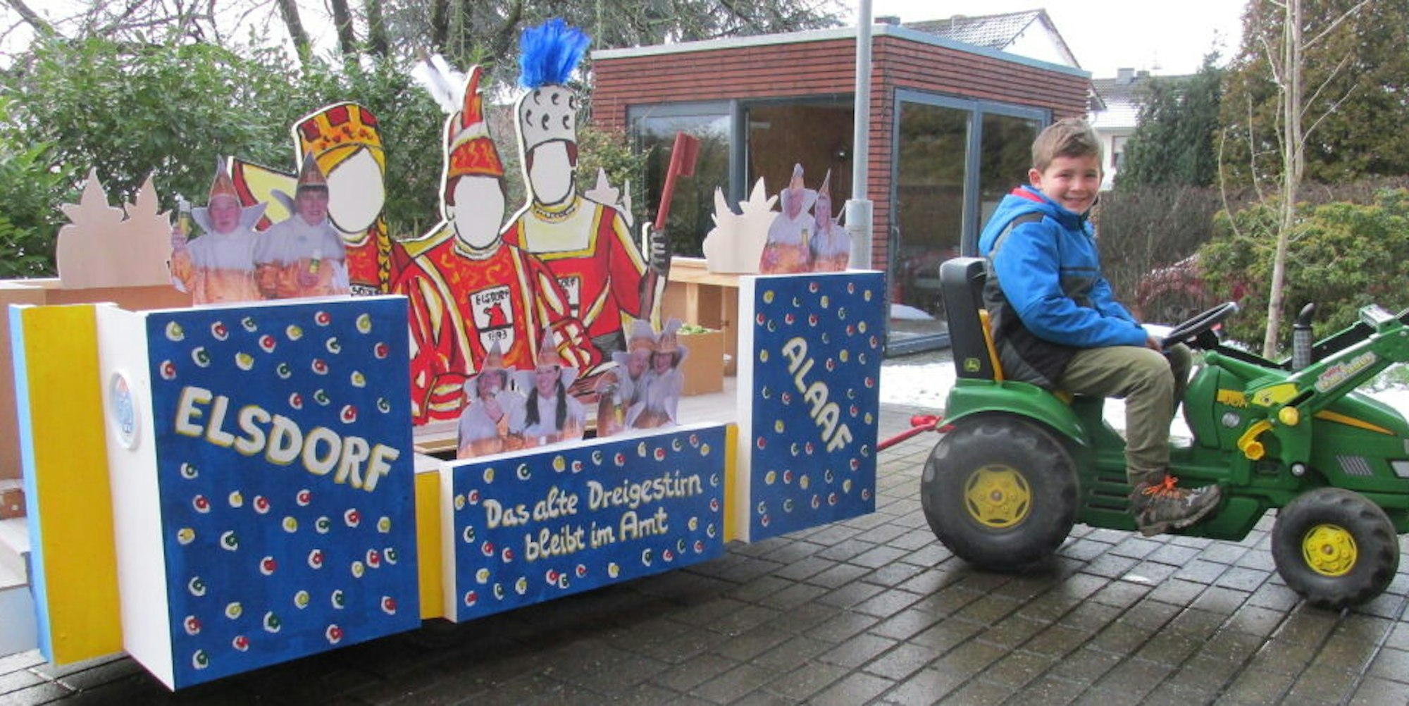 Der von Jonah Hennigs Kindertraktor gezogene Festwagen zeigt Karnevalisten aus Pappe.