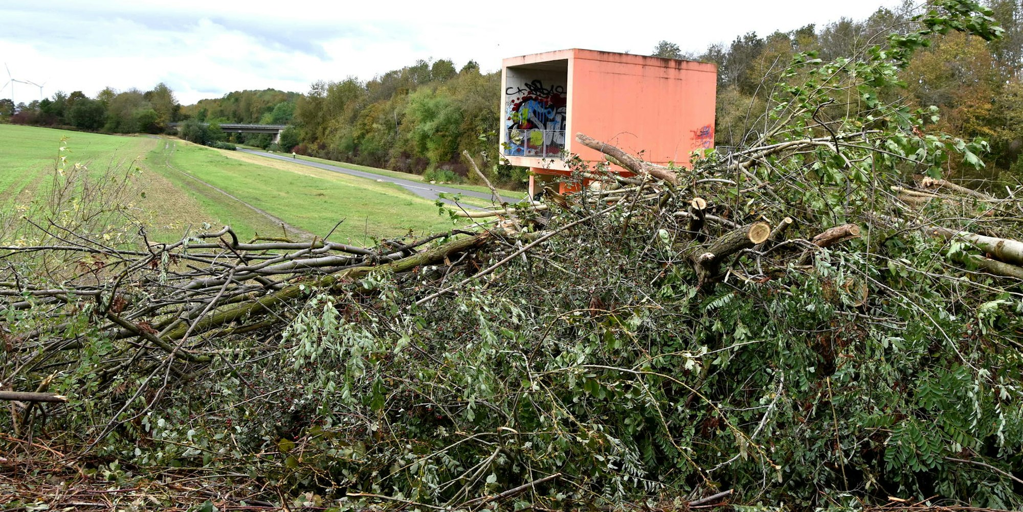 Am Terra-Nova-Kubus bei Kirdorf kreuzt die Bahntrasse den Speedway-Freizeitradweg. Hier stapelt sich das entfernte Astwerk.
