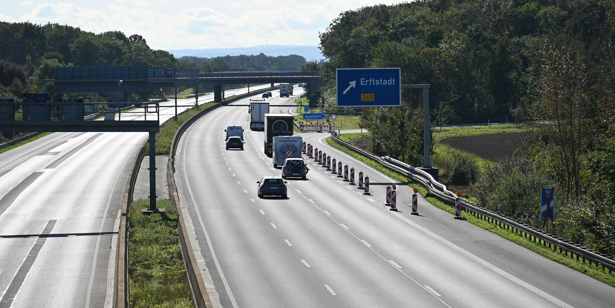 Auf der Autobahn rollt der Verkehr in Richtung Süden, die Abfahrt Erftstadt ist aber immer noch gesperrt.