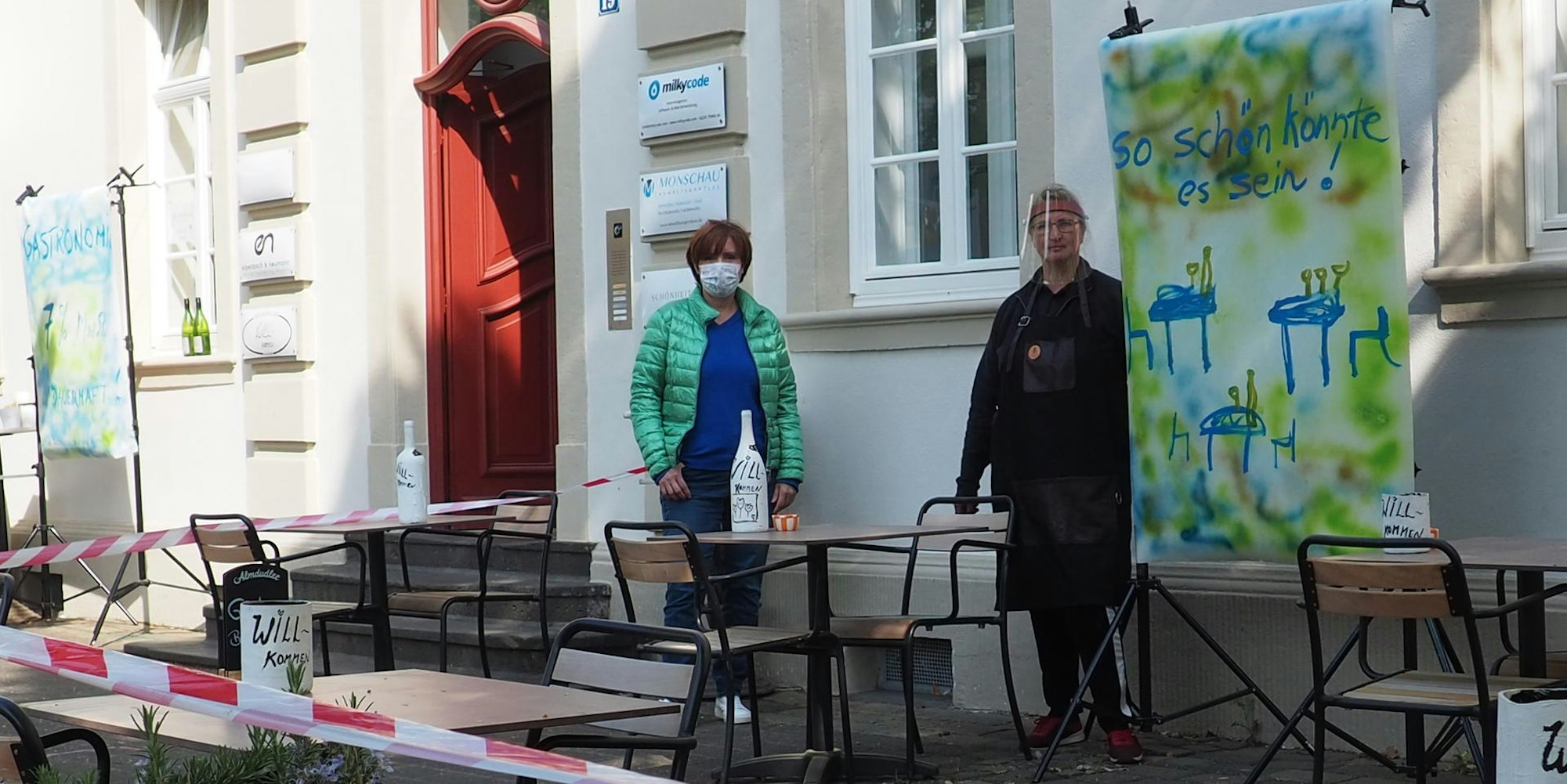 Erftstadt-Lechenich – Es sieht verlockend aus: Karin Will hat Tische und Stühle unter den Bäumen auf dem Lechenicher Marktplatz aufgebaut, Weinflaschen stehen bereit. Doch wer meint, er könne dort gemütlich im Freien essen und trinken, wird enttäuscht, Flatterband versperrt den Zugang. „So schön könnte es sein!“, steht auf einem Plakat vor dem Bistro „Will-Kommen“.