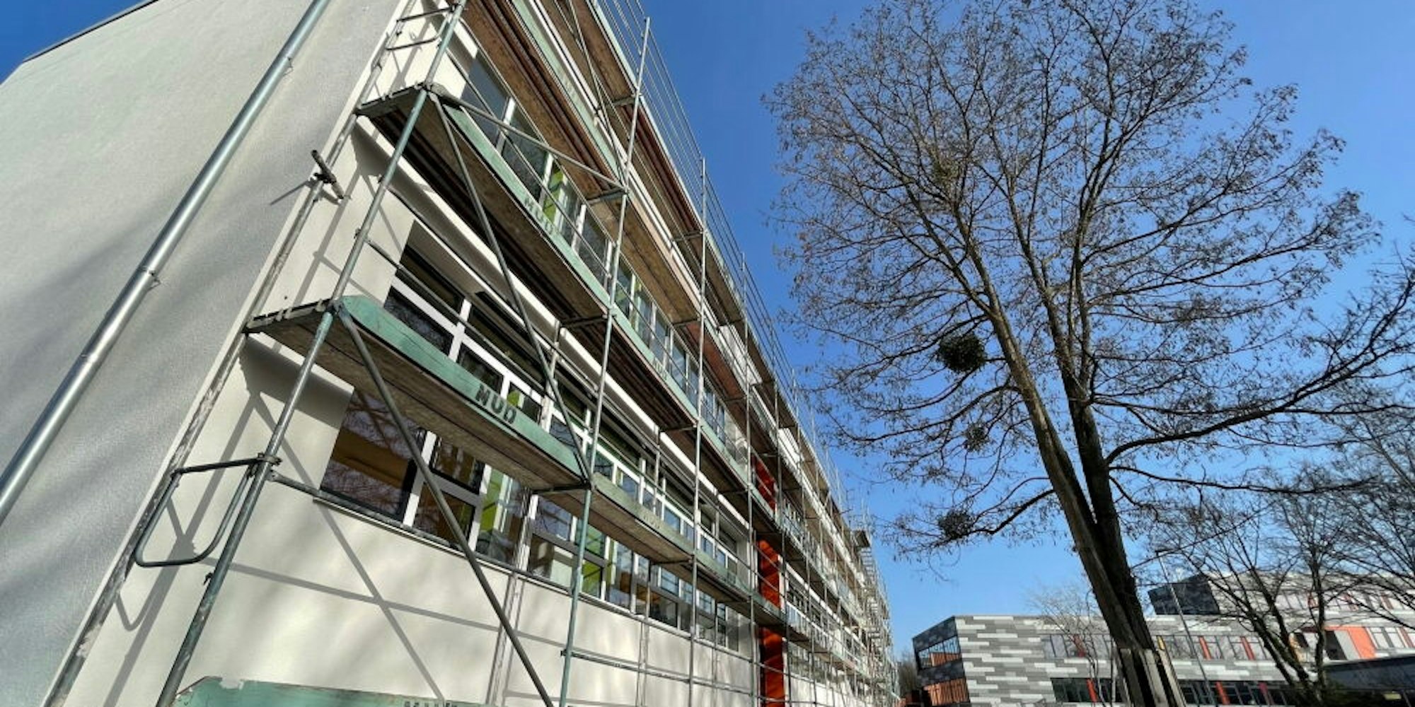 Das Mobiliar ist bereits in den renovierten Räumen aufgestellt. Die Büros sind vorübergehend in Containern auf dem Schulhof untergebracht, bevor sie später wieder ins Gebäude am Marienplatz zurückkehren . Derweil haben auch die Arbeiten an der alten Marienschule am Marienplatz begonnen. Dort entsteht das „Haus der Erwachsenenbildung“. Die alten Sanitäranlagen sind bereits entfernt worden.