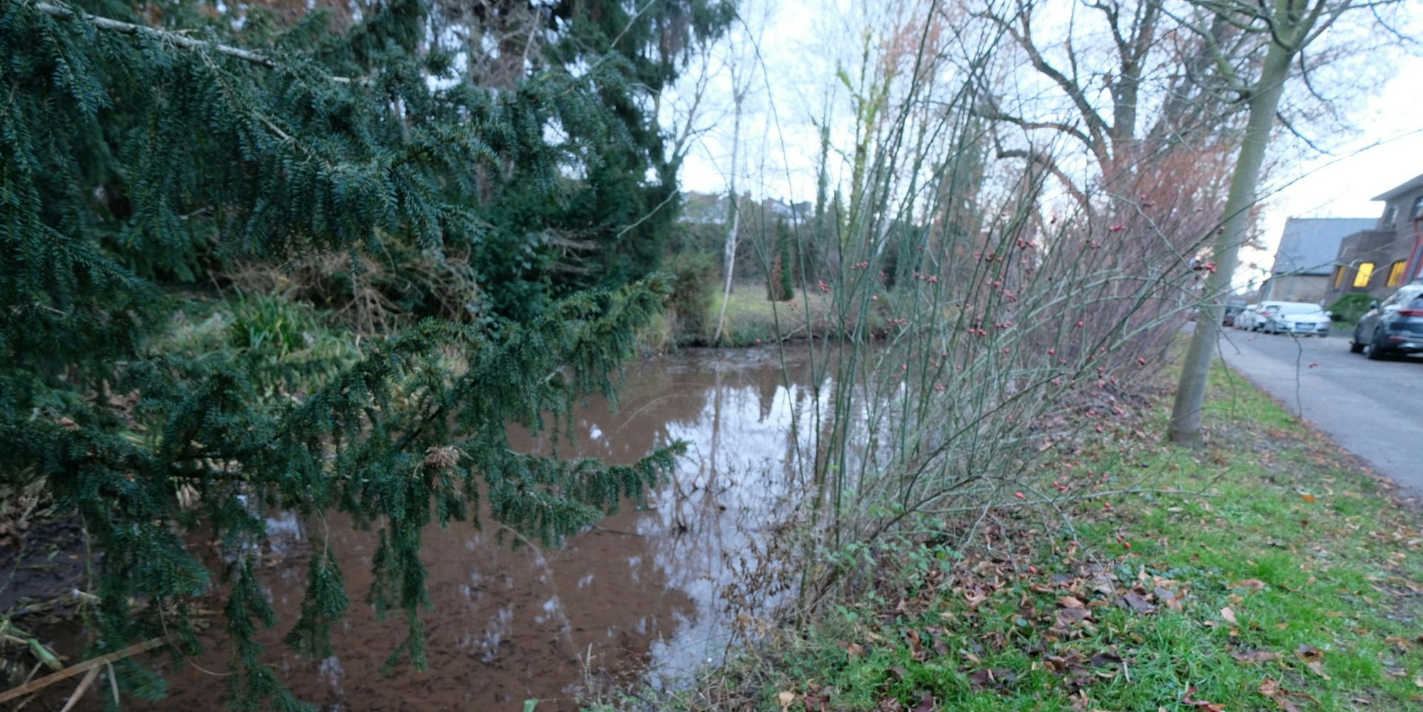 Deutlich sichtbar ist im Gewässer der rot gefärbte Schlamm, der entsorgt werden muss.