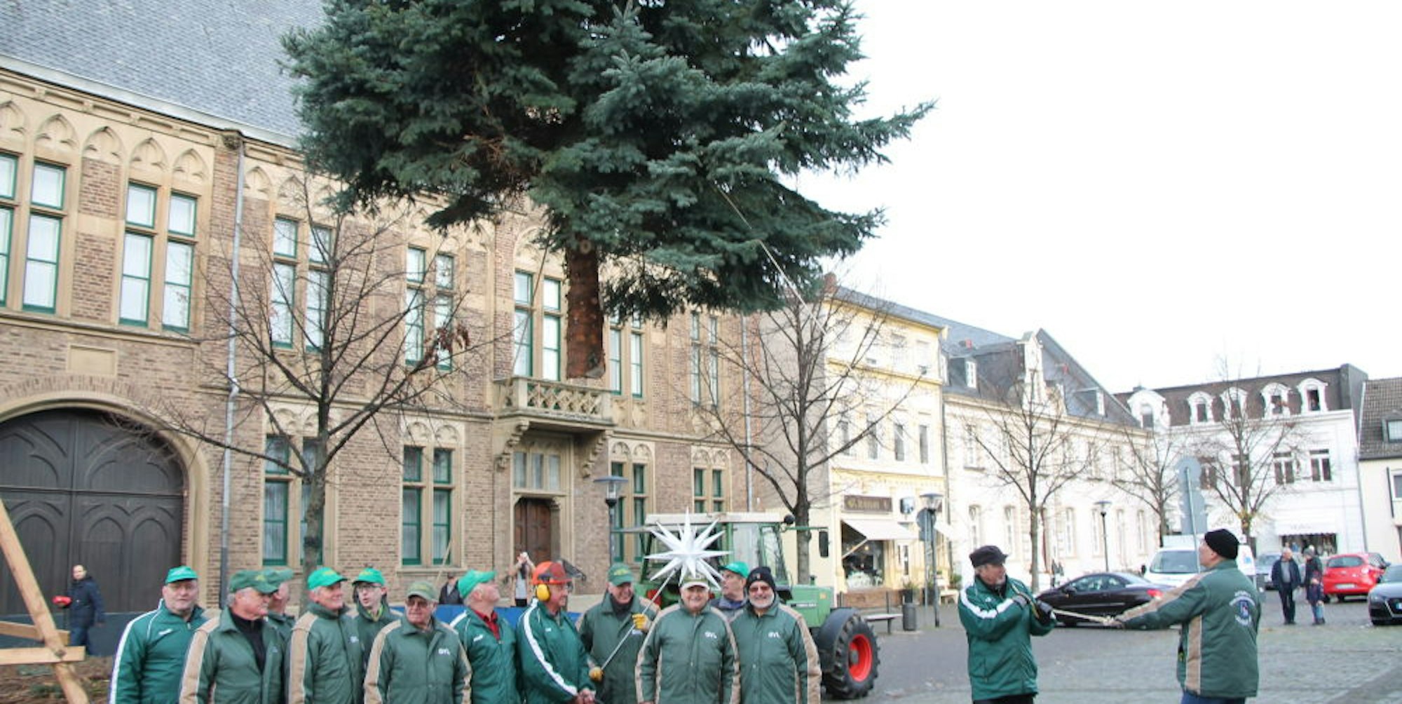 Mit ihr läutete der Gartenbau- und Verschönerungsverein Lechenich nun die Weihnachtszeit ein. „Der Baum ist eine Spende von Lydia Tybussek“, erzählte Vereinsvorsitzender Johannes Oberhofer. Auf dem Tieflader, gezogen von einem Traktor, haben die Vereinsaktiven den Baum im Schritttempo durch Lechenich bis zum Marktplatz gefahren. Dort nahm ein Kran die Tanne an den Haken und platzierte sie in der Halterung, die im Boden eingelassen ist.