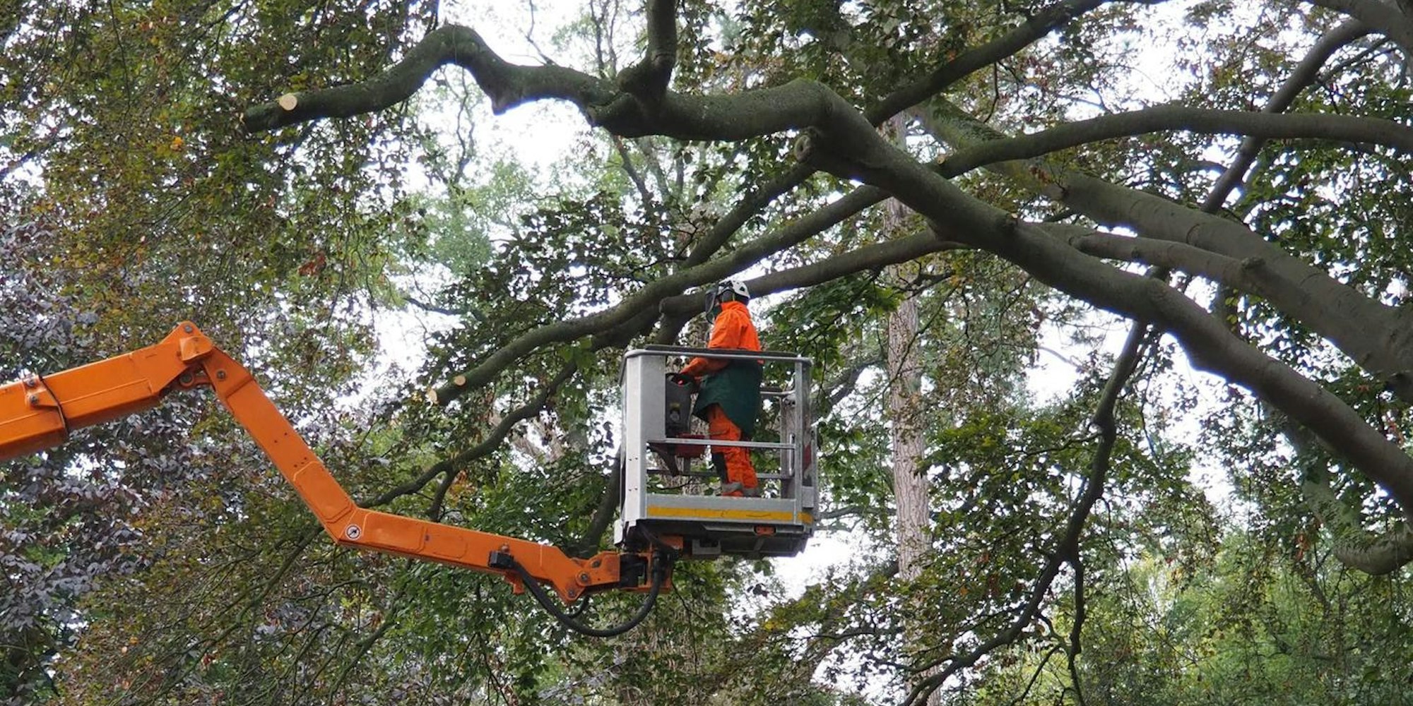 Ein Blick aus 30 Metern Höhe – vom Hubsteiger aus – bestätigt, dass der Baum nur noch schütter belaubt ist. Von dort aus kann man auch gut sehen, wie in den vergangenen Jahren versucht worden ist, die Blutbuche zu retten. Noch 2019 ist sie deutlich zurückgeschnitten worden, Seile wurden gespannt, um die drei dicken Stämme, in die sich der Baum aufteilt, zusammenzuhalten. Vergebens: Als vor einigen Wochen noch einmal getestet wurde, welchen Belastungen er stand hält, war klar, dass er nicht mehr sicher steht.