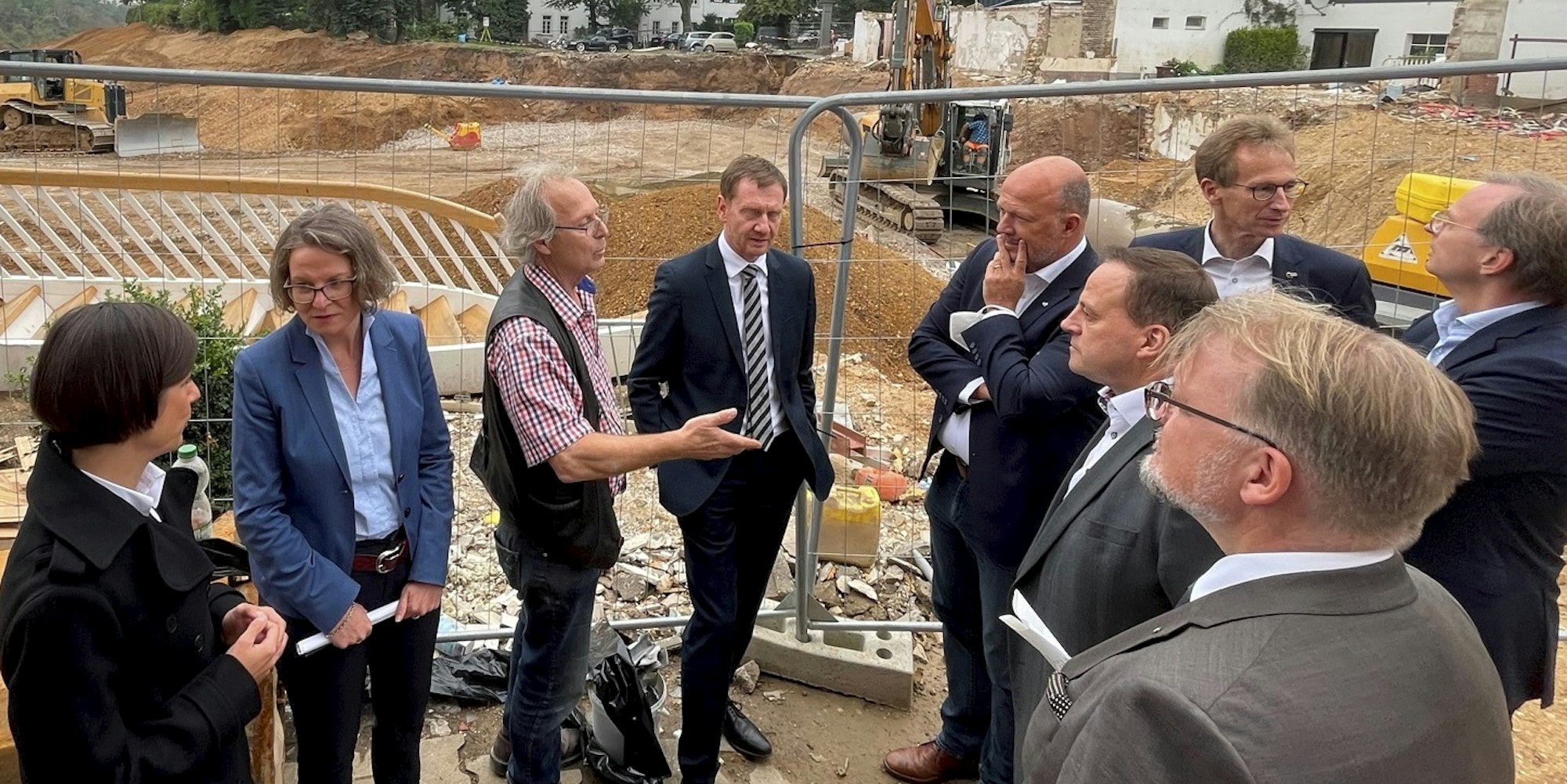Erftstadt-Blessem – Ungewöhnlichen Besuch erhielten die Blessemer am Mittwoch in Sichtweite der großen Abbruchkante am Ortsrand. Sachsens Ministerpräsident Michael Kretschmer machte sich zusammen mit NRW-Bauministerin Ines Scharrenbach und weiteren Gästen ein Bild von der Lage nach der Flutkatastrophe.