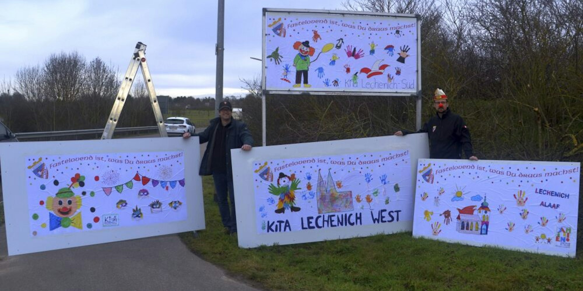 Erftstadt-Lechenich – „Fastelovend ist, was Du draus machst!“ So lautet das aktuelle Motto an den Ortseingangsschildern an den vier Hauptzufahrtsstraßen Lechenichs. Die Mädchen und Jungen der Kindergärten Nord „Starke Pänz“, Lechenich Süd, Lechenich West und St. Kilian haben ihre Ideen und Gedanken zum Thema Karneval malerisch kreativ auf den Schildern in die Tat umgesetzt.