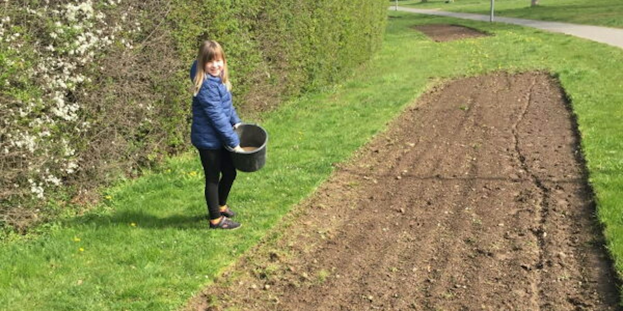 Erftstadt-Bliesheim – Nach einer kurzen Einweisung beginnt die neunjährige Hannah Jüssen: Sie greift in den Eimer mit den Blumensamen und wirft sie kräftig und mit weit ausladender Geste auf die vorbereitete Fläche.