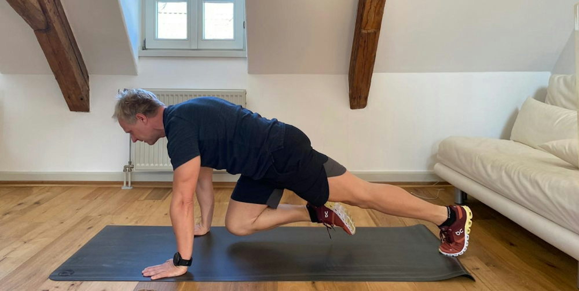 Wir stellen Ihnen die Übungen vor und beginnen mit dem „Mountainclimbing“ (Bild oben): Ziehen Sie die Beine im Wechsel an den Oberkörper bis zur Höhe der Ellenbogen. Strecken Sie das Bein nun wieder, stellen Sie den Fuß ab und machen dasselbe mit der anderen Seite.
