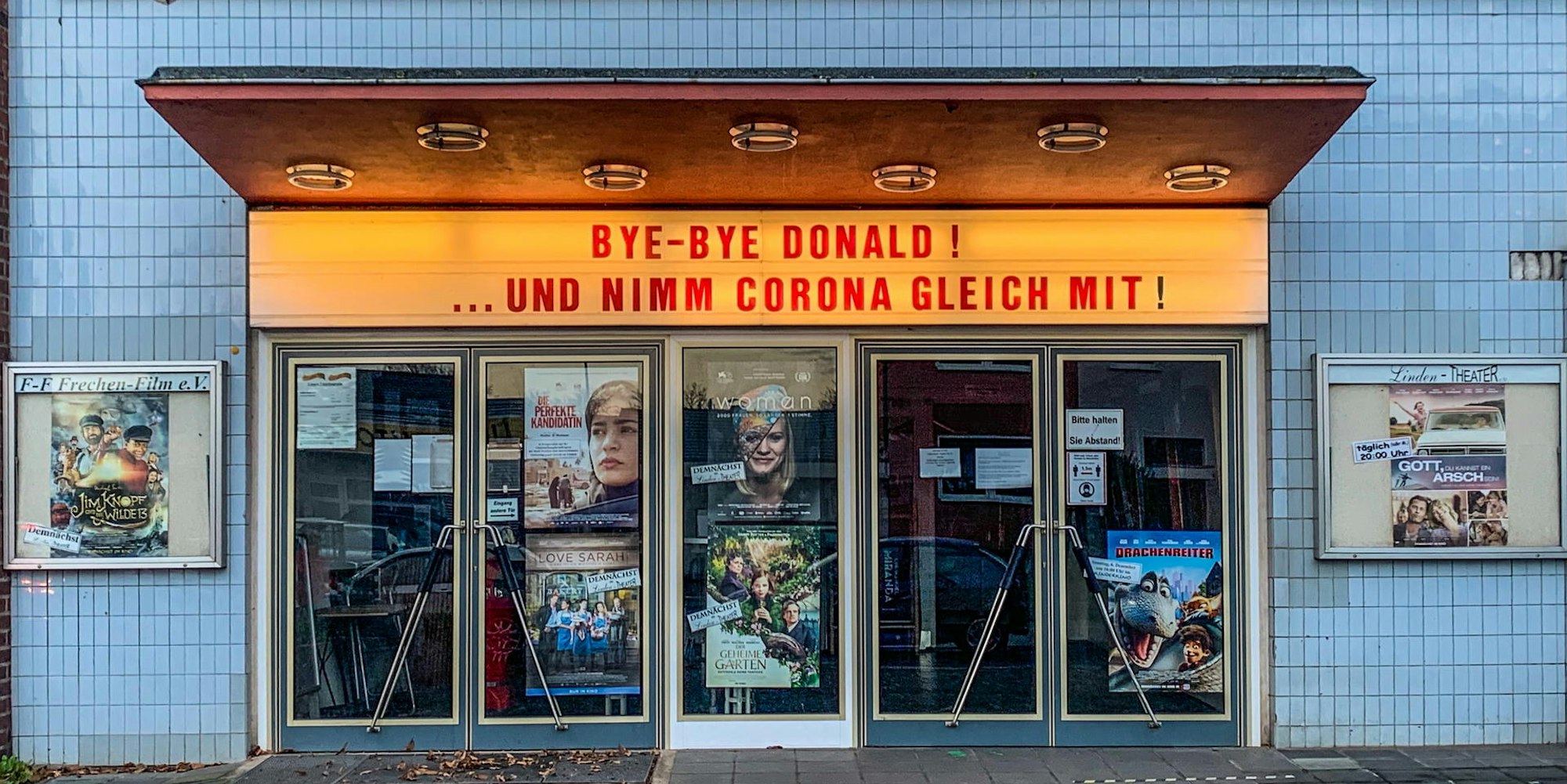 Nach der US-Wahl nimmt das Linden-Theater nun Abschied von Präsident Trump: „Bye-Bye Donald!“ ist derzeit an der Front des Lichtspielhauses zu lesen: „...und nimm Corona gleich mit!“ Letzteres ist sicherlich ein Wunsch, denen sich alle, die von der Pandemie und den damit verbundenen Einschränkungen besonders stark betroffen sind, gern anschließen werden. (rtz)