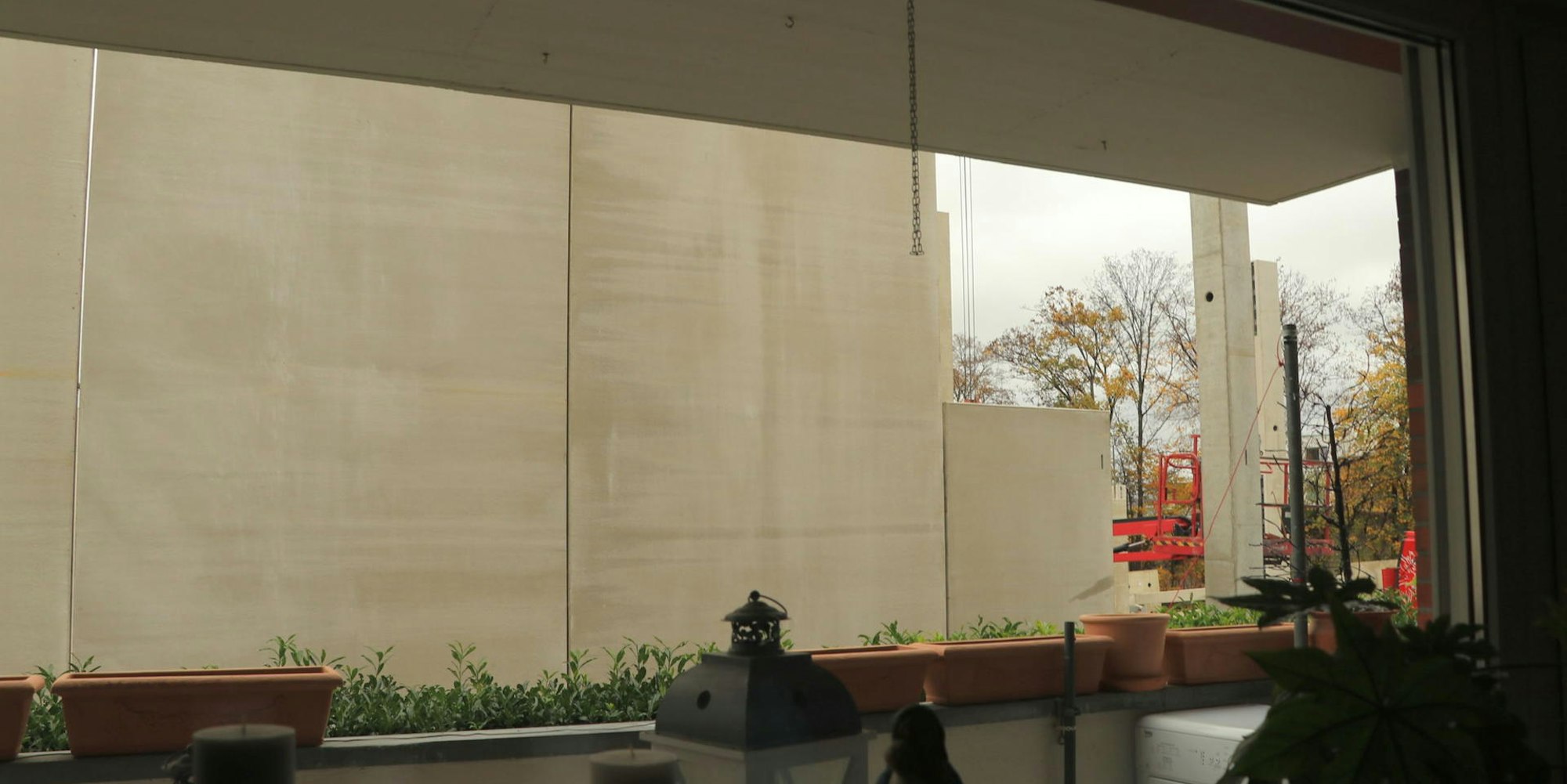 Von den Balkonen des Hauses aus bietet sich in der Tat ein bizarres Bild: von schöner Aussicht keine Spur, stattdessen blickt man auf eine trostlose graue Betonmasse.