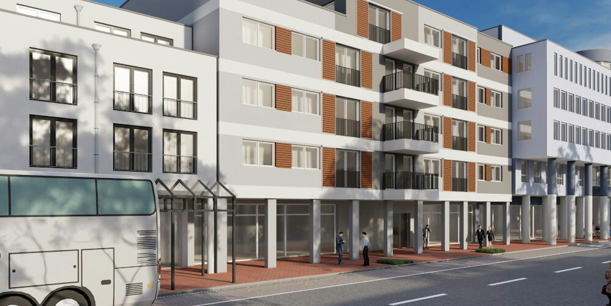 Der vier - bis fünfgeschossige Neubau erhält eine Putzfassade, die teilweise durch Keramik akzentuiert werden soll. Die an das Baugrundstückes angrenzenden Arkaden am Busbahnhof sollen am Neubau fortgesetzt werden.