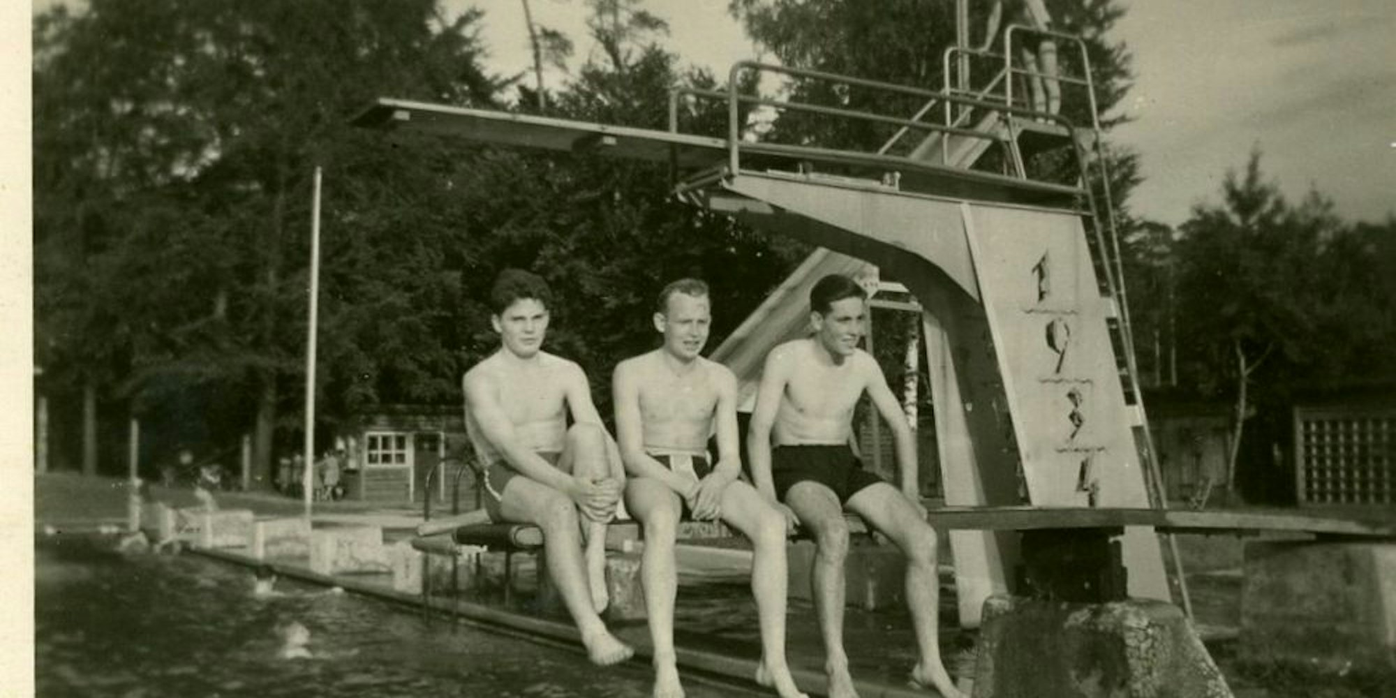 Eine Abkühlung verschafften sich die Gesellen Hermann Hermes, Heinz Görgens und der später dazugekommene Helmut Prinz (v.l.) im Freibad von Burghausen in Oberbayern.