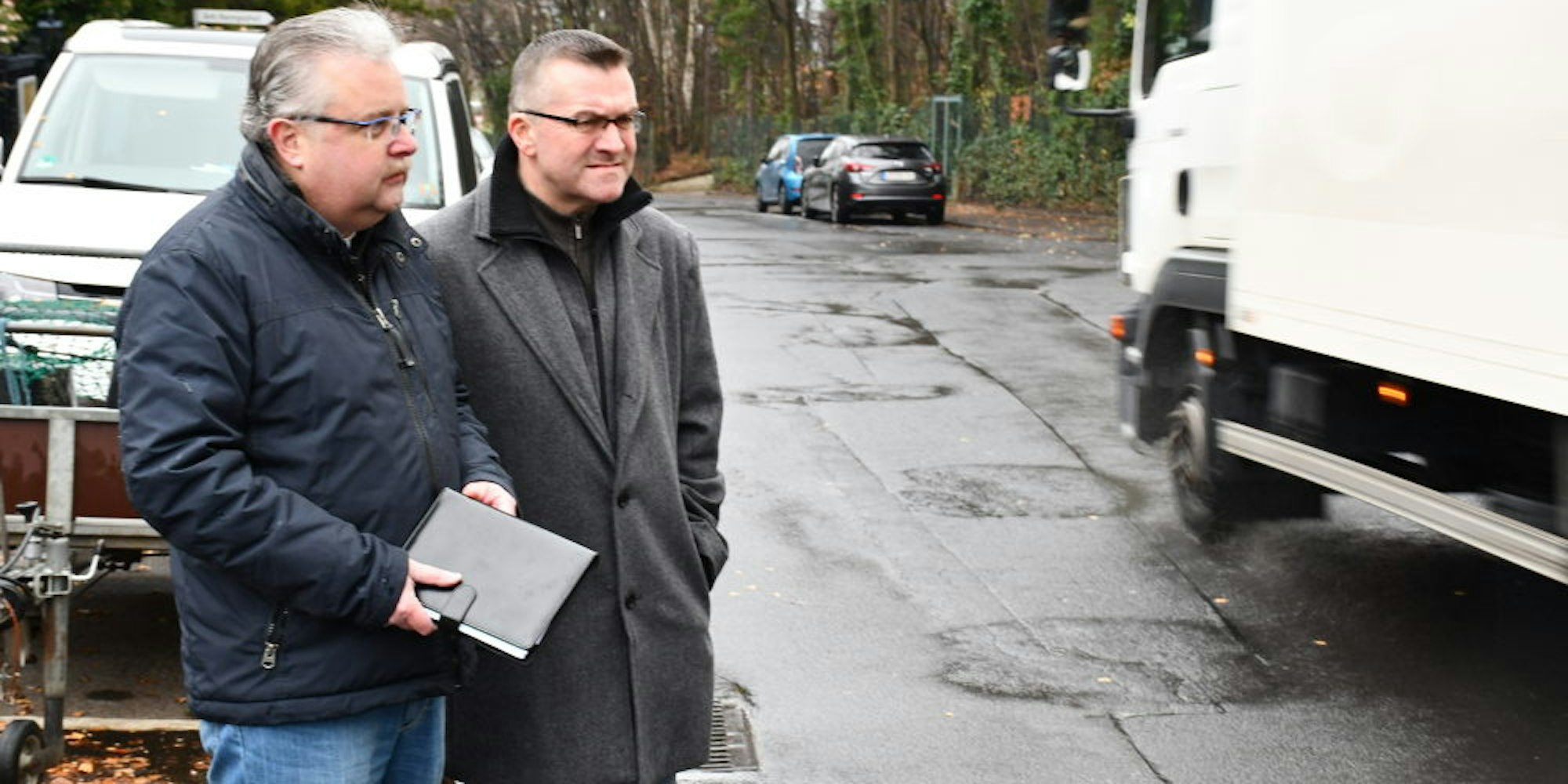 Thomas Klug (l.) und Ortsvorsteher Frank Baer fordern Lösungen für die beklagten Verkehrsprobleme in Kendenich. Vor allem der Lkw-Verkehr belaste die Anwohner.