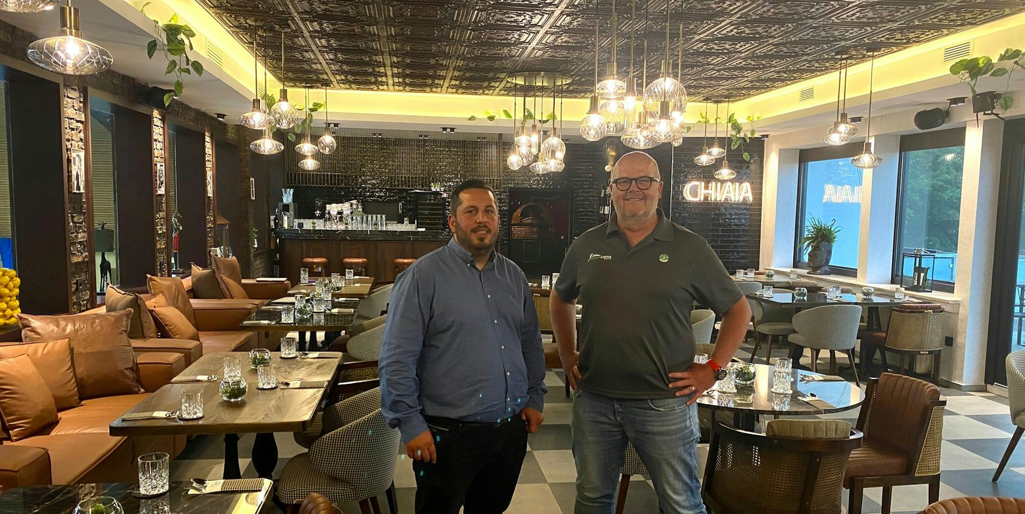 Der Betreiber des Restaurants, Selcuk Sen (l.), und der Geschäftsführer der Racket-Arena Rhein-Erft, Christian Mauritz.