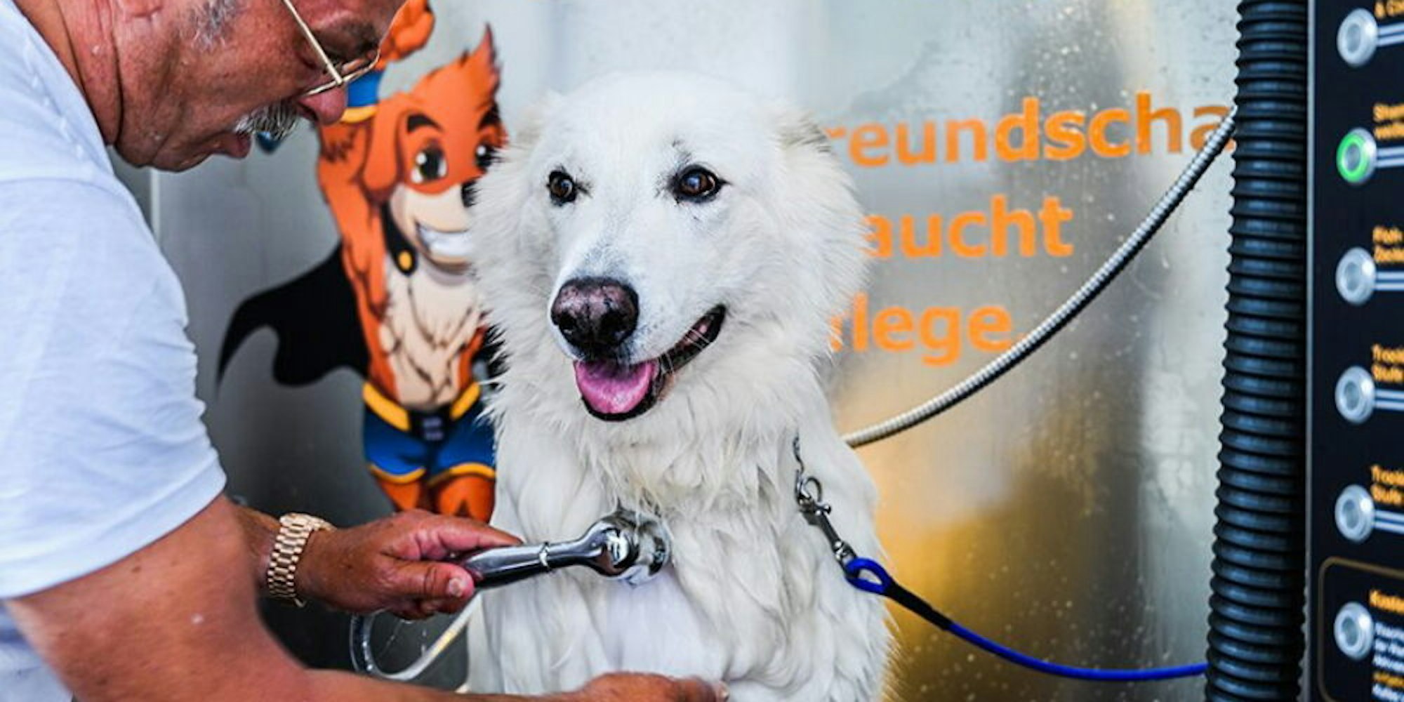 Einmal Waschen und Fönen – in der ersten Hundewaschanlage an der Donatusstraße in Brauweiler ist das möglich.