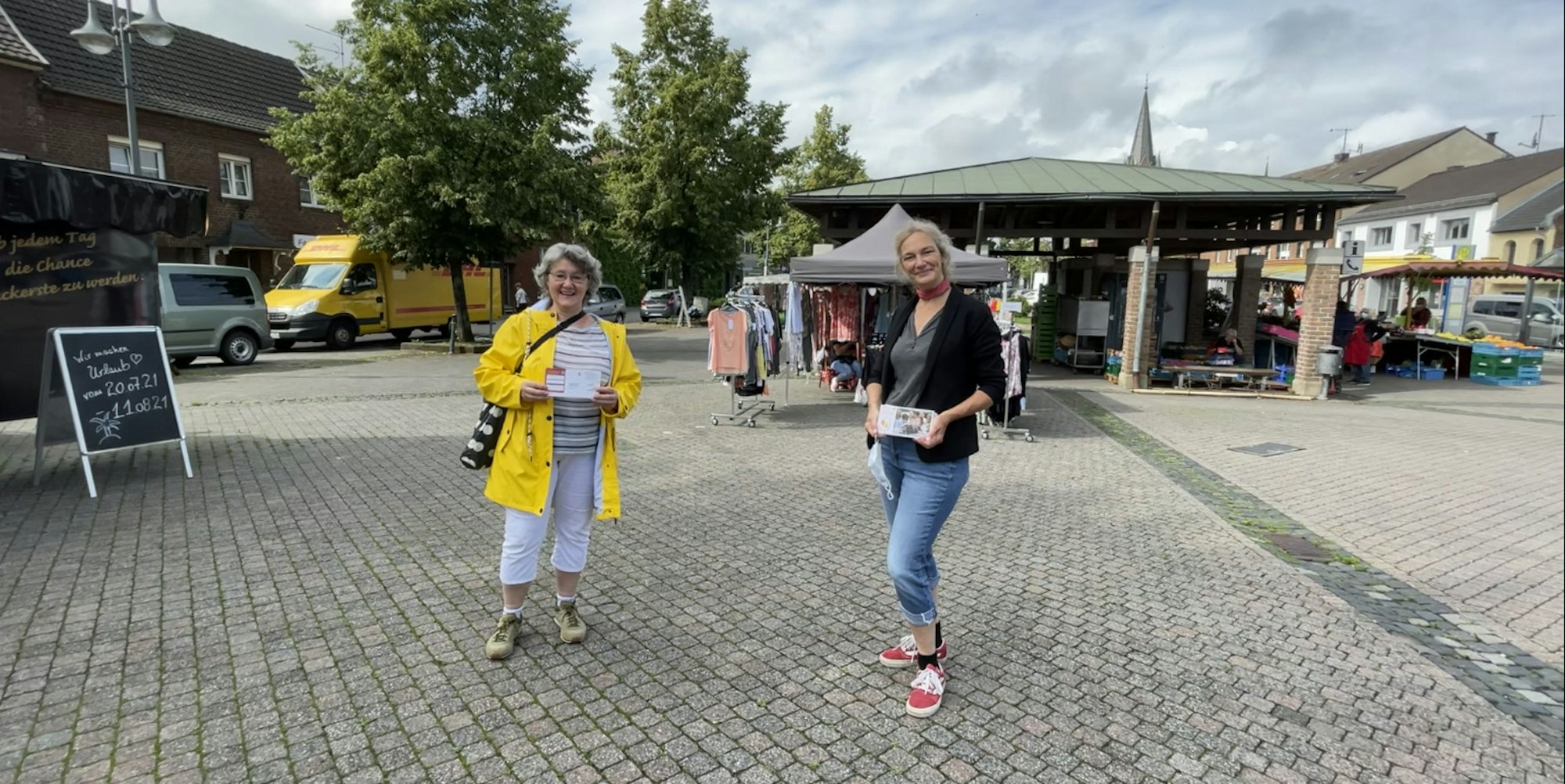 Anette Göhler (r.) und Janine Schiller von der Aktionsgruppe „Stommeln für die Bücherei“ beim Verteilen der Protestkarten.